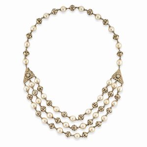 in argento e oro giallo 18k, Peso g 87,40 cm 50,00 a due fili di perle coltivate disposte a degradé dal centro [..]