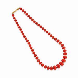in oro giallo 18k, Peso g 52,00 cm 48,50 ad un filo di barilotti di corallo rosso disposti a degradè dal centro [..]