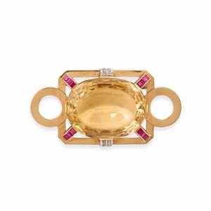 in oro bicolore 18k, Peso g 43,90 cm 3,80x7,20 di forma stilizzata al centro quarzo citrino taglio ovale di ct [..]