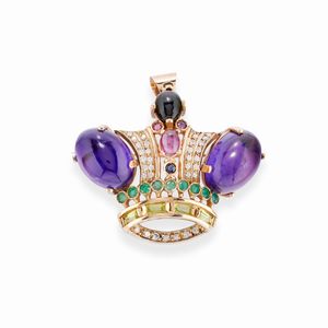 in oro bicolore 14k, Peso g 21,54 cm 5,00x4,00 a forma di corona con ametiste taglio ovale cabochon, smeraldi [..]