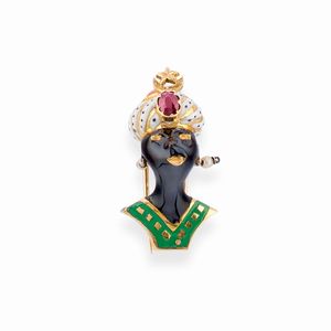 in oro giallo 18k, Peso g 12,70 cm 1,50x3,50 con granato, smalto policromo, perle e corallo.