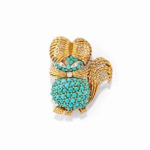 in oro giallo 18k, Peso g 15,90 cm 3,40x4,10 raffigurante gatto, con turchesi taglio rotondo cabochon, diamanti [..]