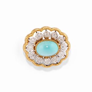in oro bicolore 18k, Peso g 22,20 cm 3,00x3,50 di forma ovale al centro turchese taglio ovale cabochon, diamanti [..]