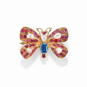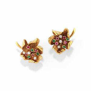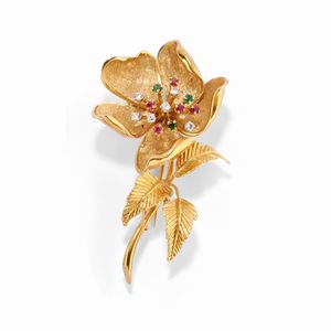 in oro giallo 18k, Peso g 14,70 cm 3,50x4,00 con rubini, zaffiri e smeraldi taglio navette, goccia, ovale e baguette, [..]