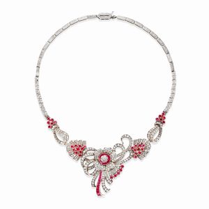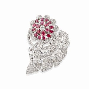 in platino, Peso g 37,00 cm 5,50x7,50 1940 circa fiore in rubini taglio ovale per totale ct 7,00 circa, foglie [..]