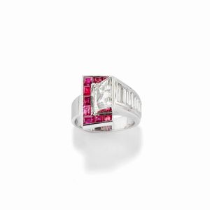 in platino, Peso g 9,15 misura 10 1940 circa diamante taglio carré di ct 2,20 circa, colore K, purezza VS, rubini [..]