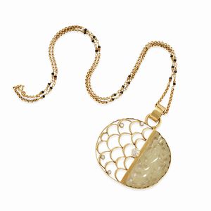 in oro bicolore 18k, Peso g 67,55 cm 7,40x6,20-37,70 di forma ovale con motivo orientale traforato in giadeite, [..]