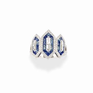 in oro bianco 18k, Peso g 6,20 misura 14 sommità geometrica con zaffiri taglio fantasia per totale ct 2,50 circa [..]