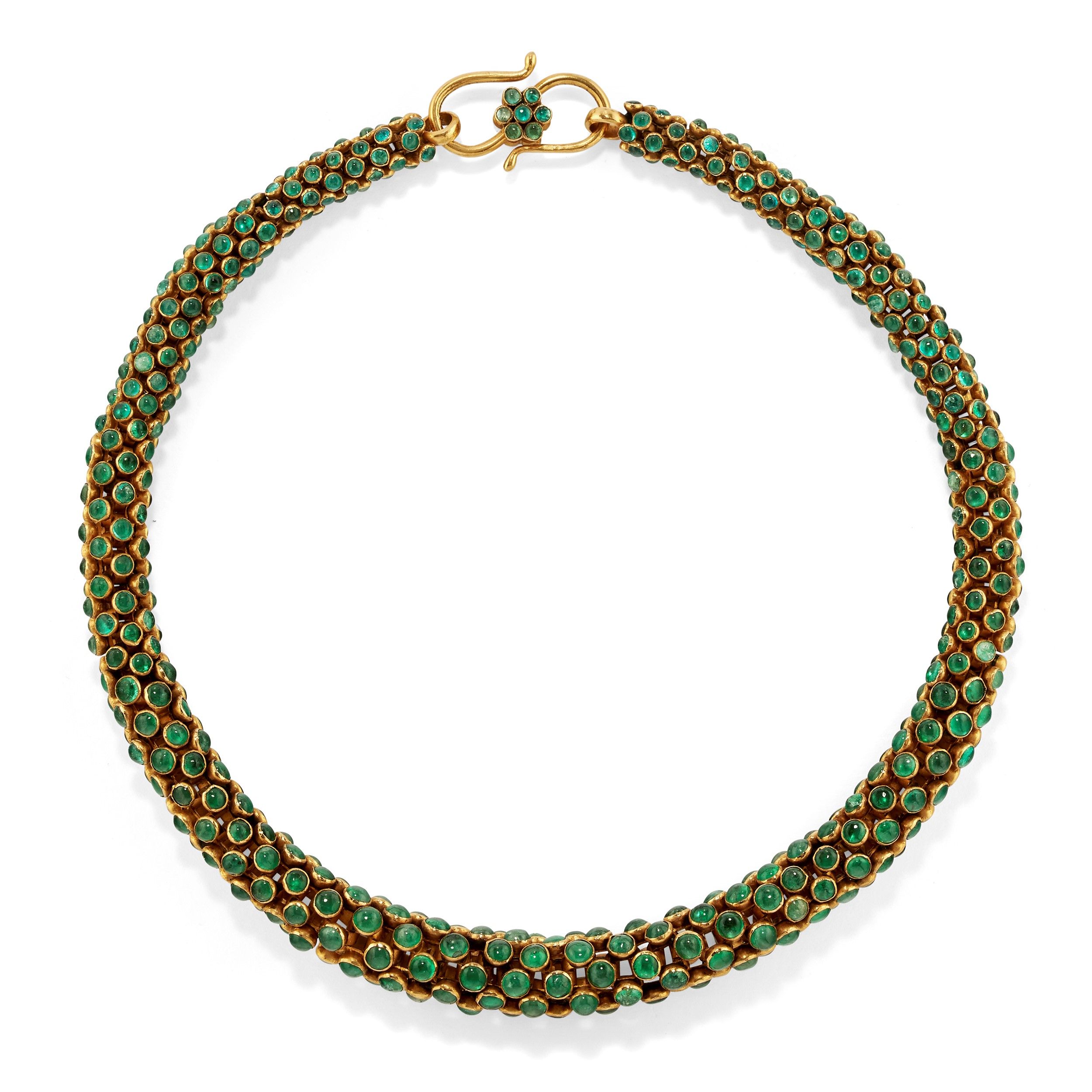 maglia tubolare con smeraldi taglio rotondo cabochon entro castone ribattuto disposti a tutto giro.