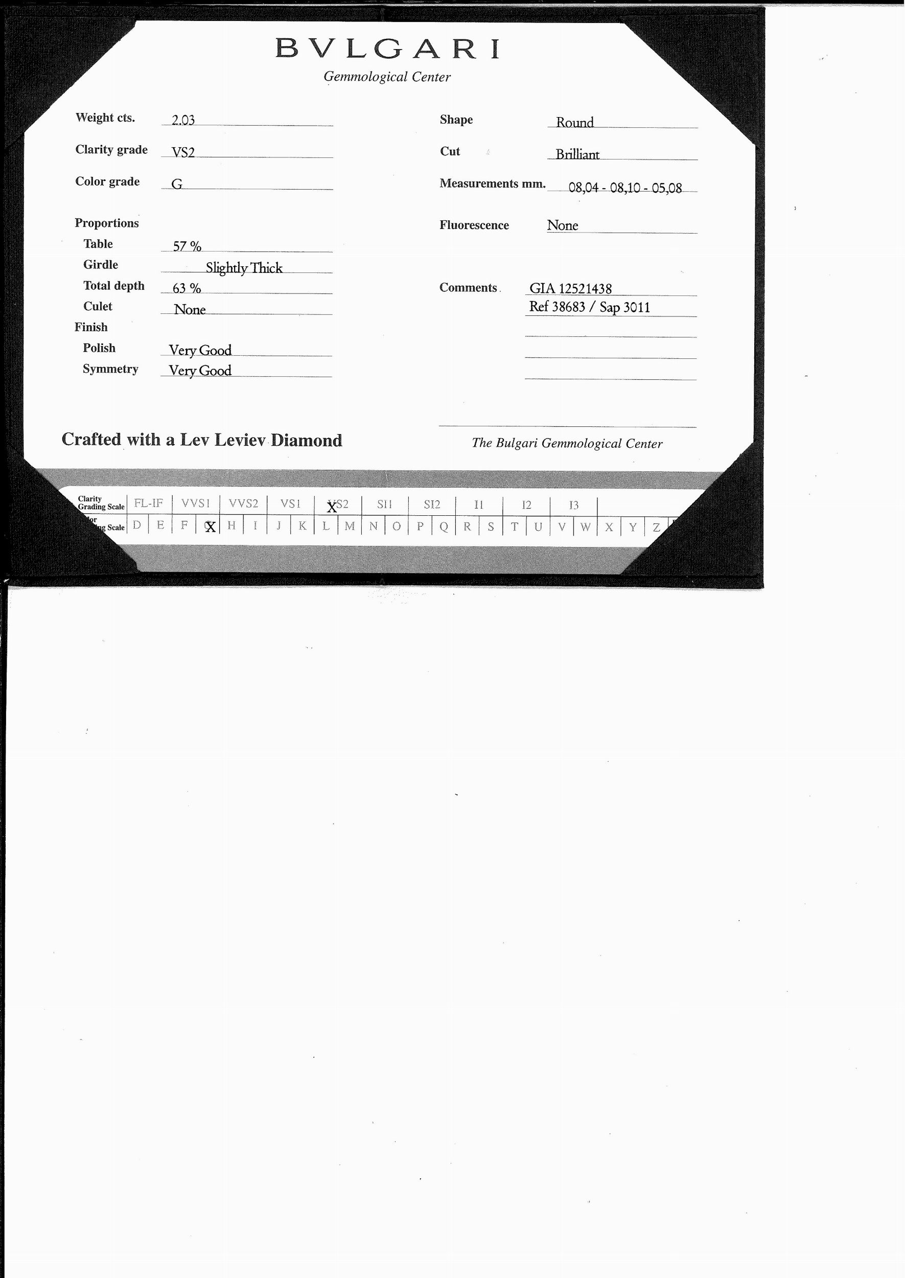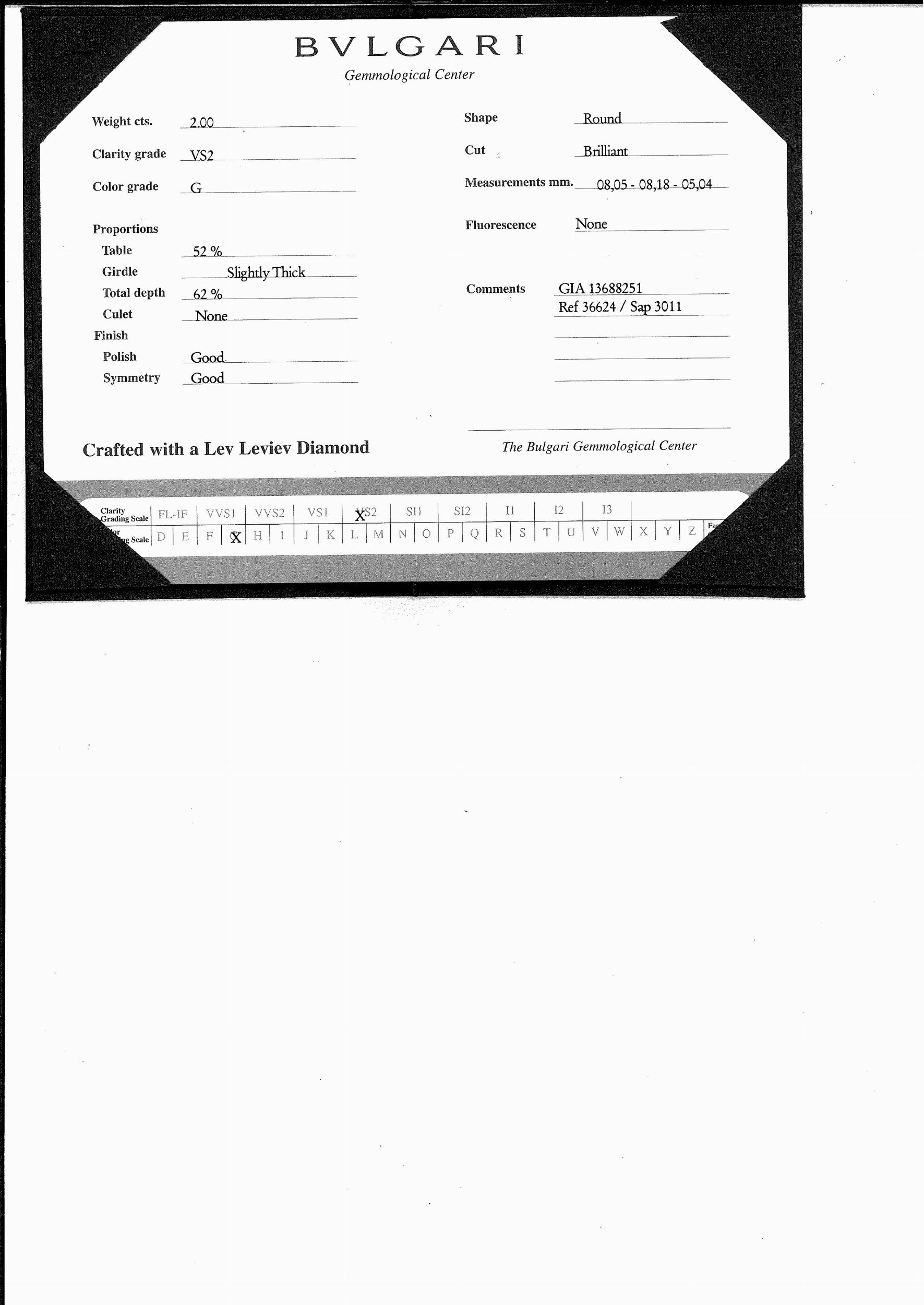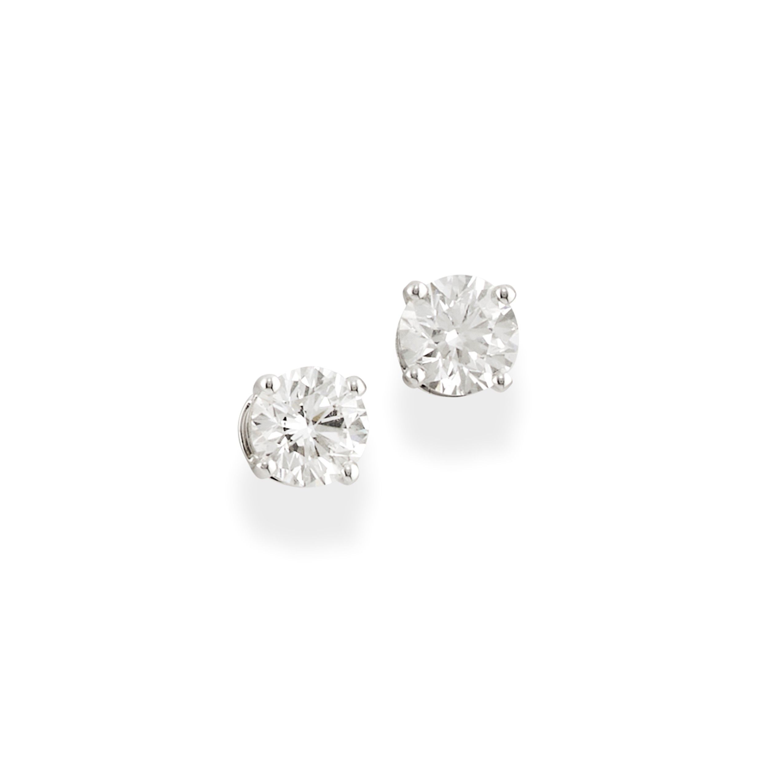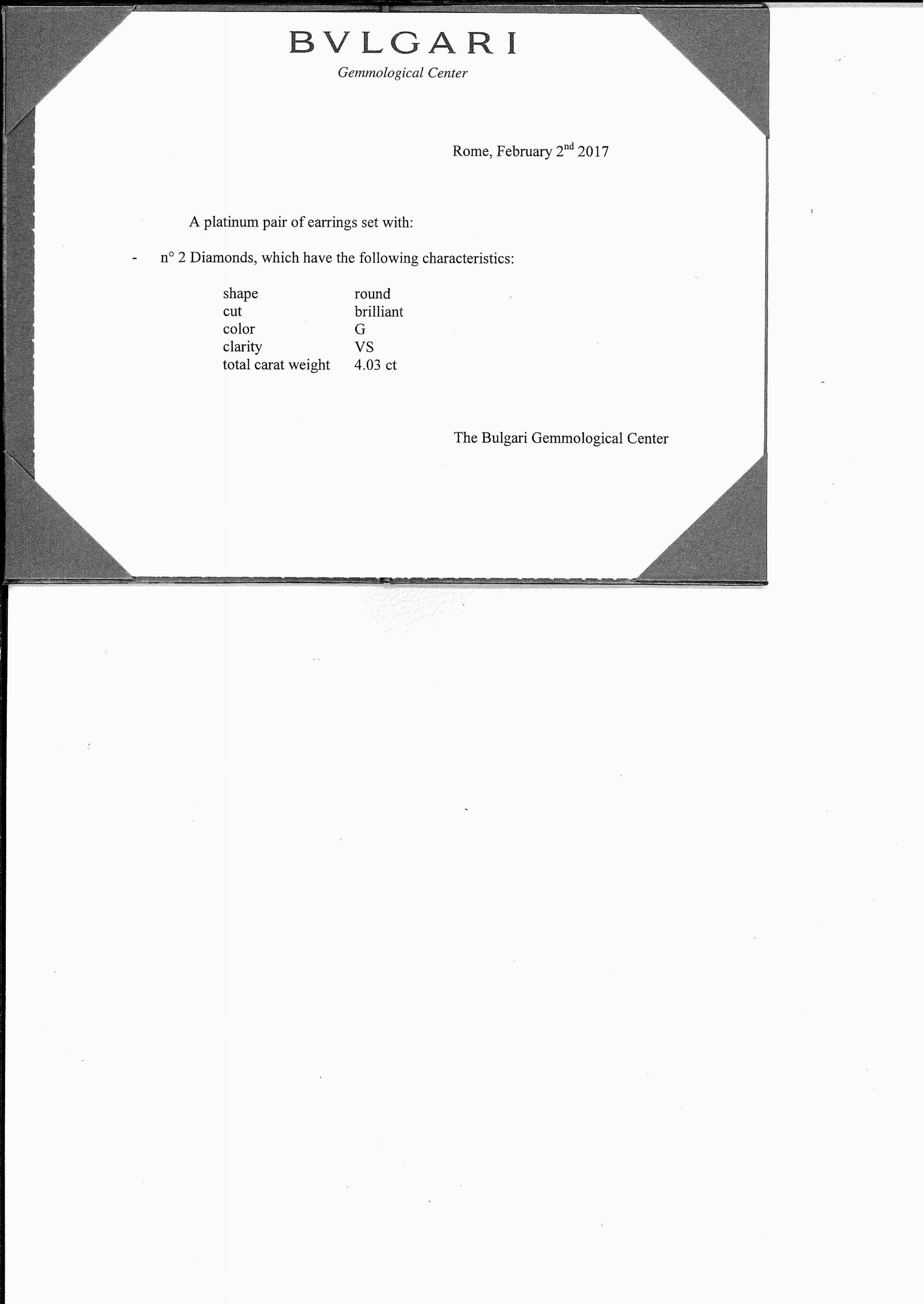 un diamante taglio brillante di ct 2,00, colore G, purezza VS2 ed un diamante taglio brillante di ct 2,03, colore G, purezza VS2, chiusura perno e farfalla, con astuccio e diamond report di Bulgari.