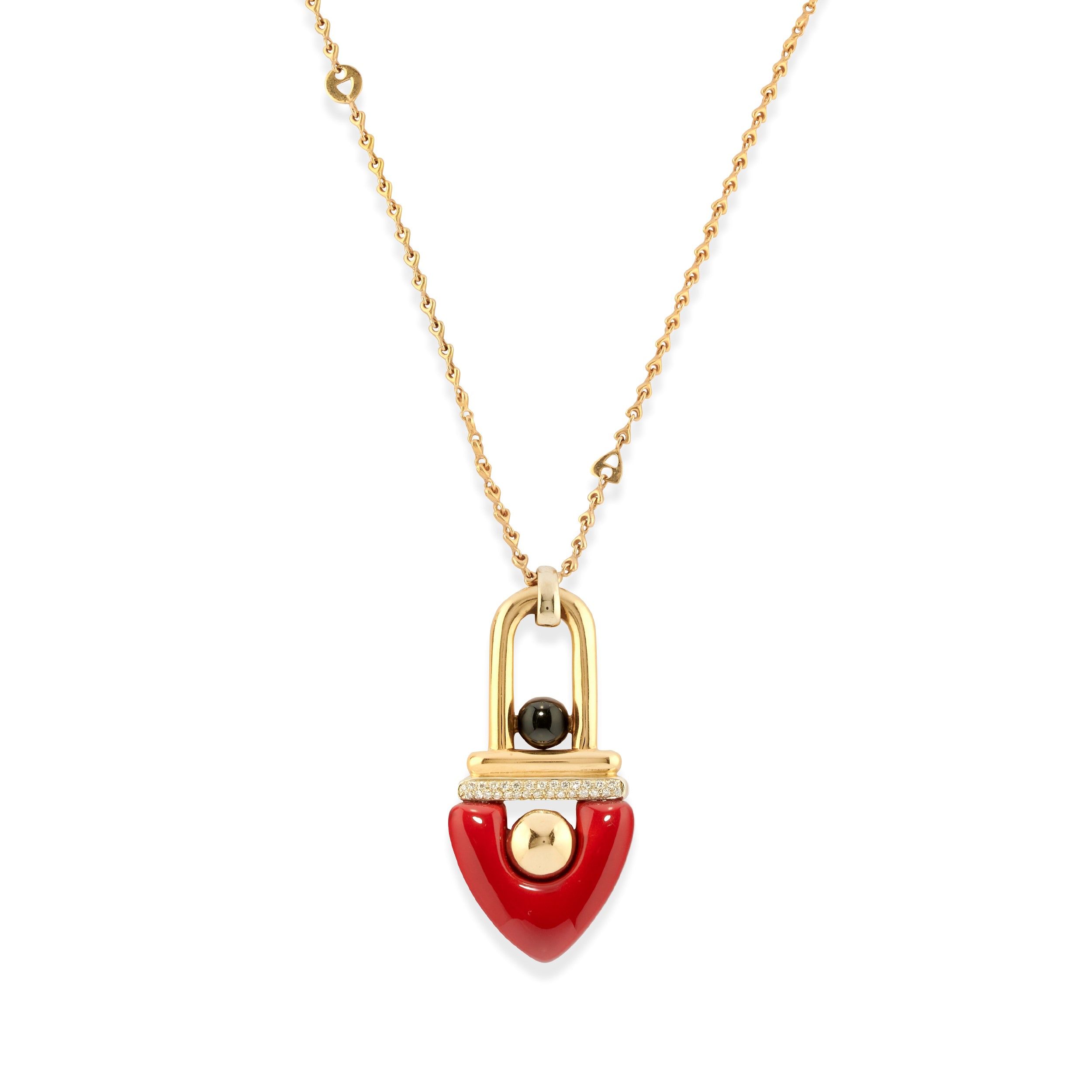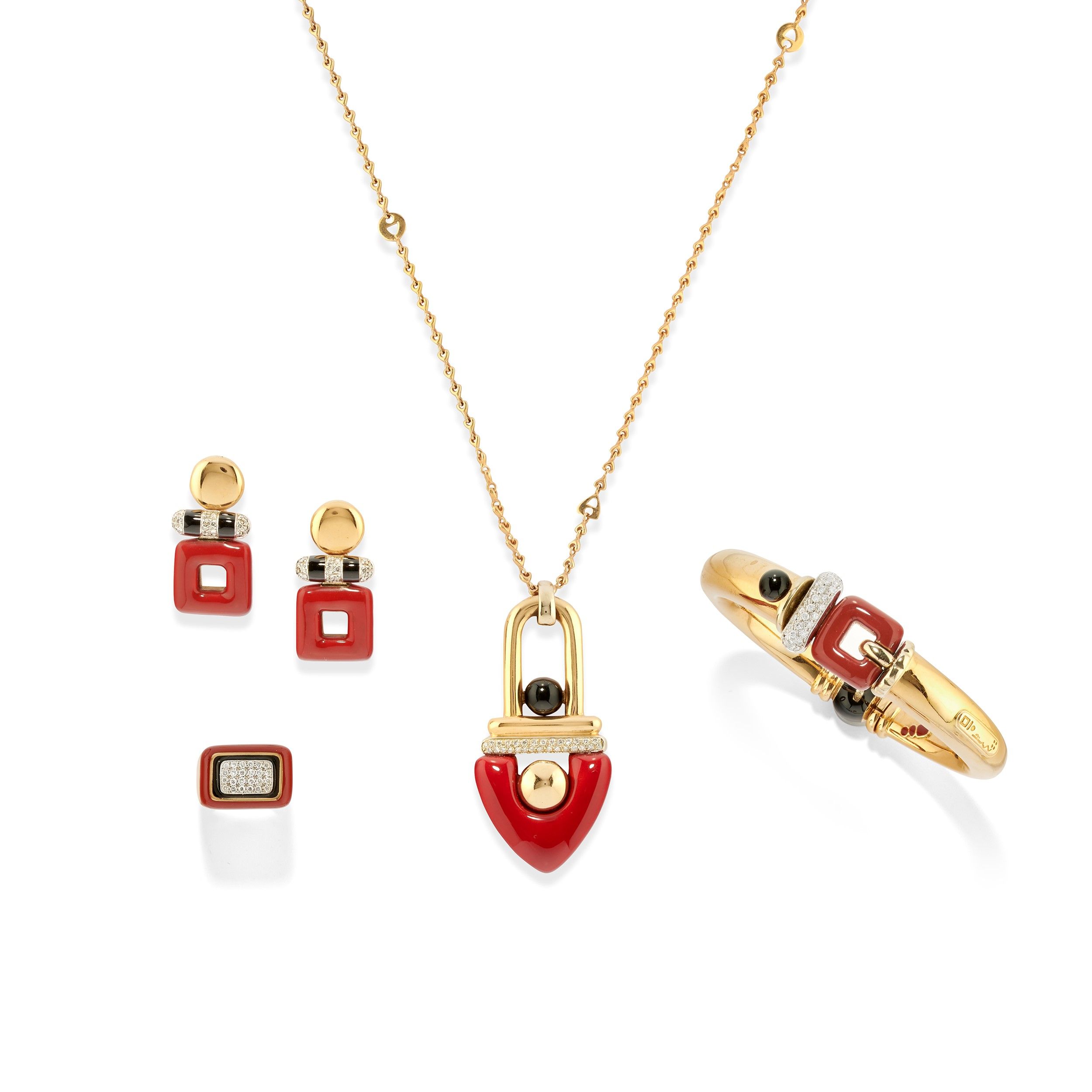 composto da bracciale rigido, coppia di orecchini perno e clip, anello e collana con pendente, diamanti taglio brillante e smalto nero e rosso.