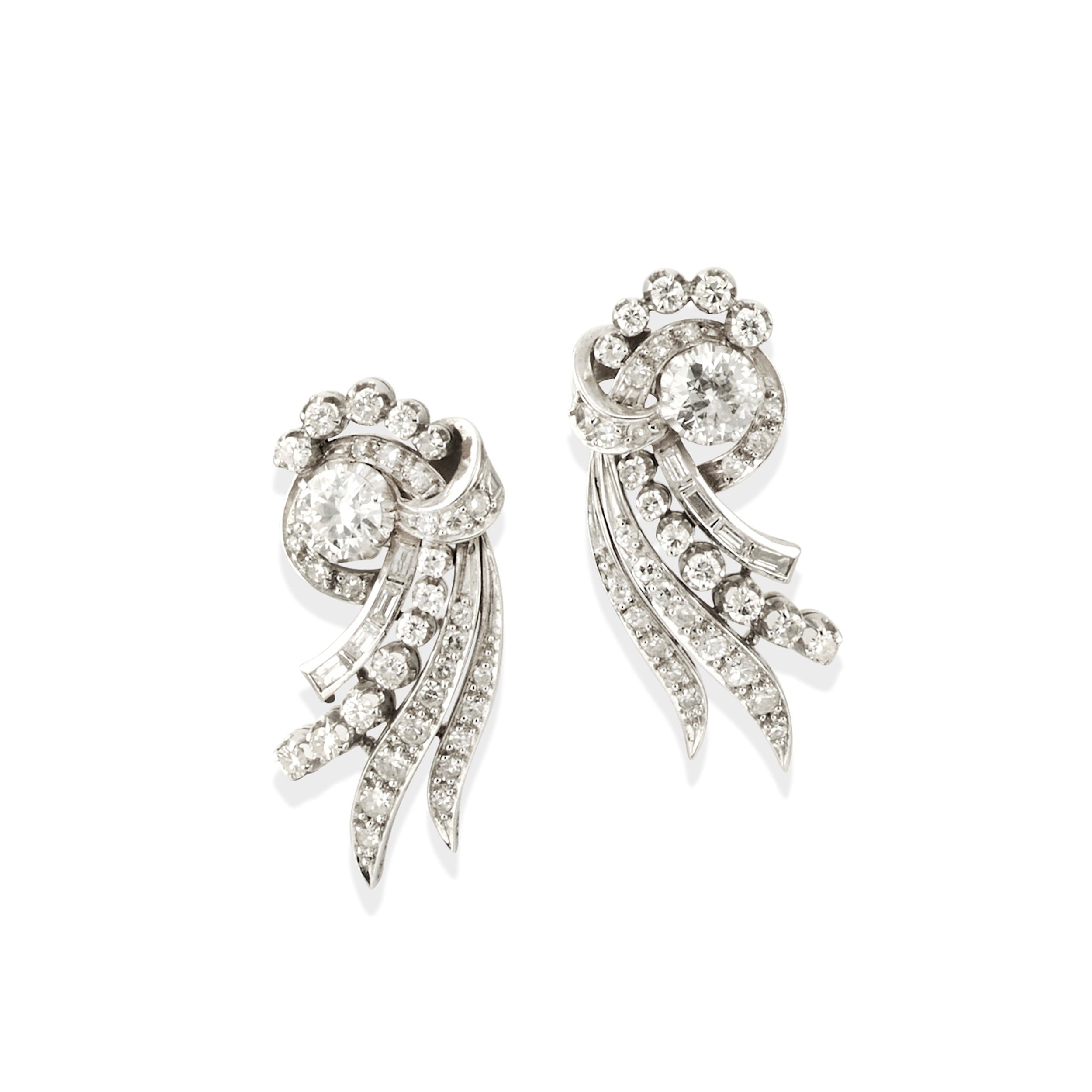 a volute con due diamanti taglio vecchio per totale ct 1,20 circa, diamanti taglio huit-huit e baguette a decoro per totale ct 1,50 circa, chiusura perno e farfalla.