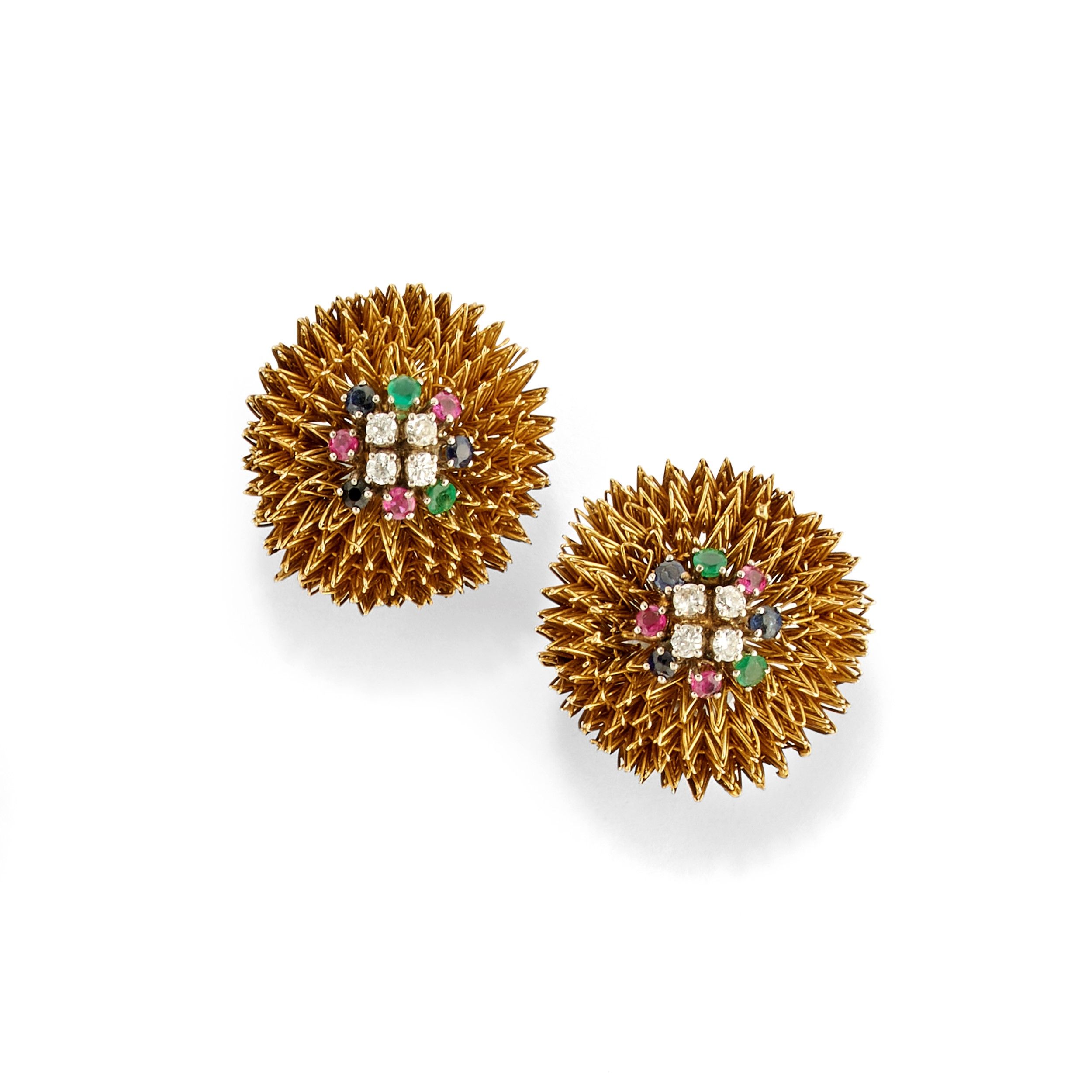 a riccio con al centro diamanti, smeraldi, rubini e zaffiri taglio rotondo, chiusura a clip.