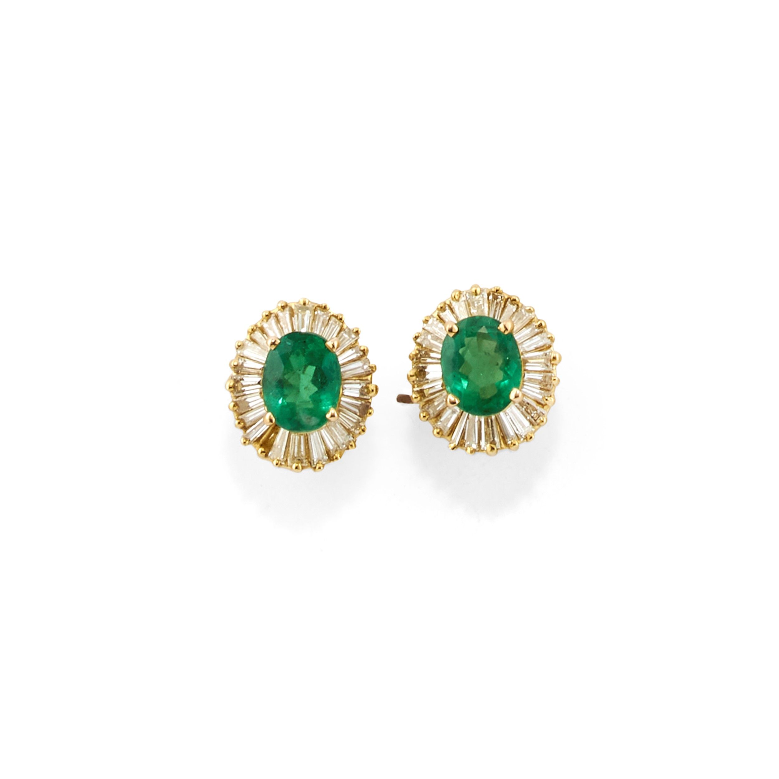al centro smeraldi taglio ovale per totale ct 1,50 circa, diamanti taglio tapered baguette per totale ct 1,50 circa, chiusura perno e farfalla, difetti (un diamante mancante).