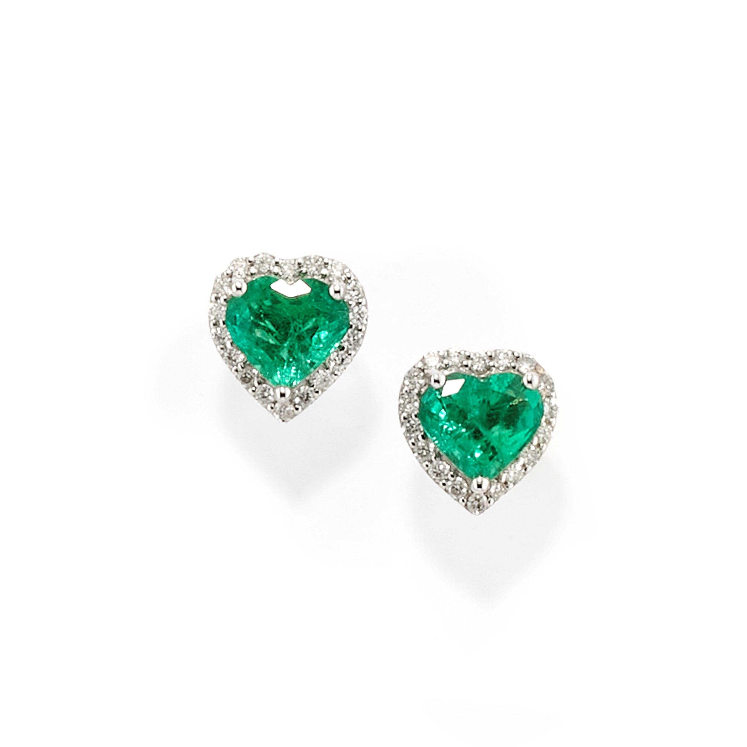 smeraldi taglio cuore per totale ct 1,50 circa e diamanti taglio brillante per totale ct 0,30 circa, chiusura perno e farfalla.