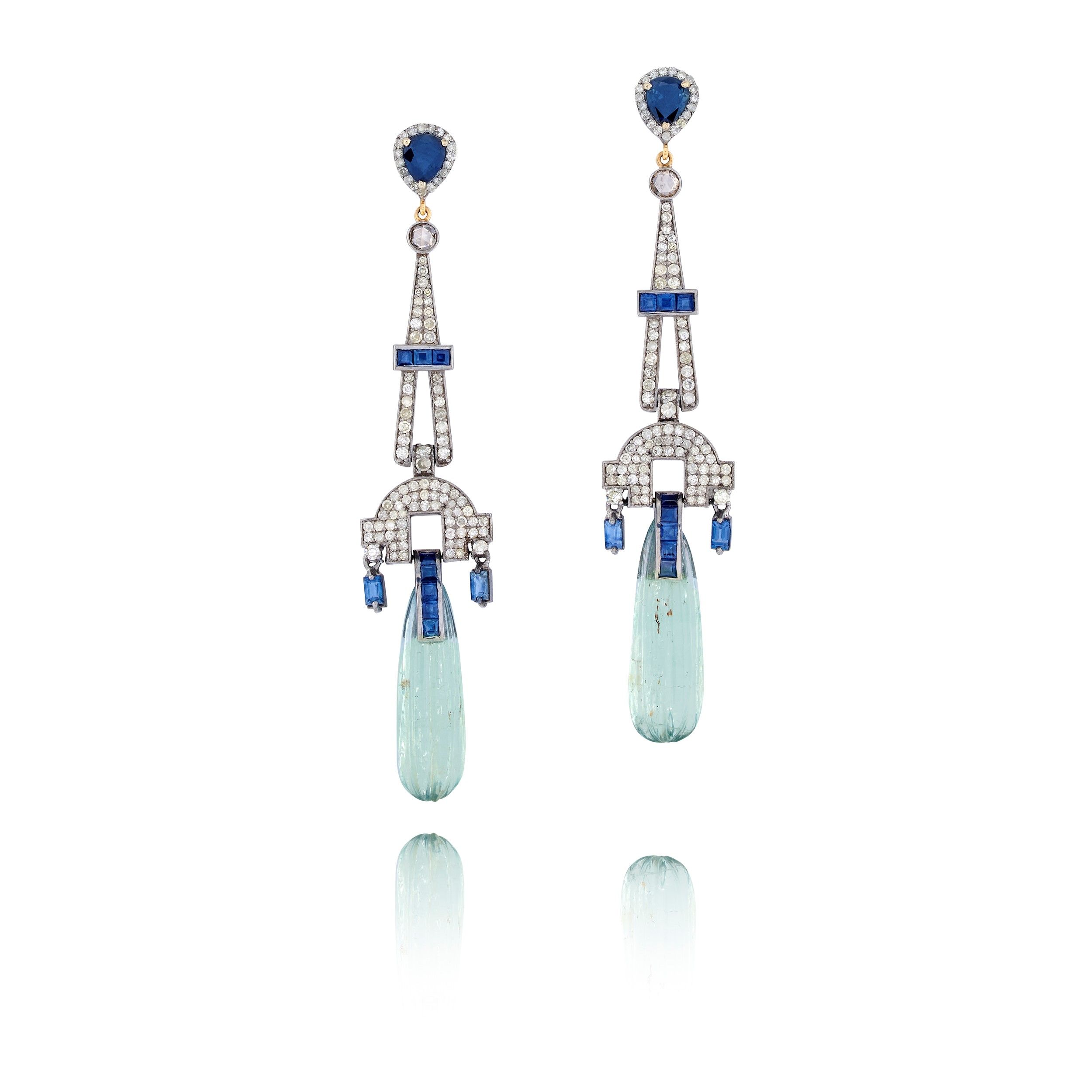 impreziositi da zaffiri taglio goccia, carrè e baguette per totale ct 3,50, diamanti taglio rotondo per totale ct 2,00 circa e acquamarine taglio goccia scanalata per totale ct 21,00 circa, chiusura perno e farfalla.