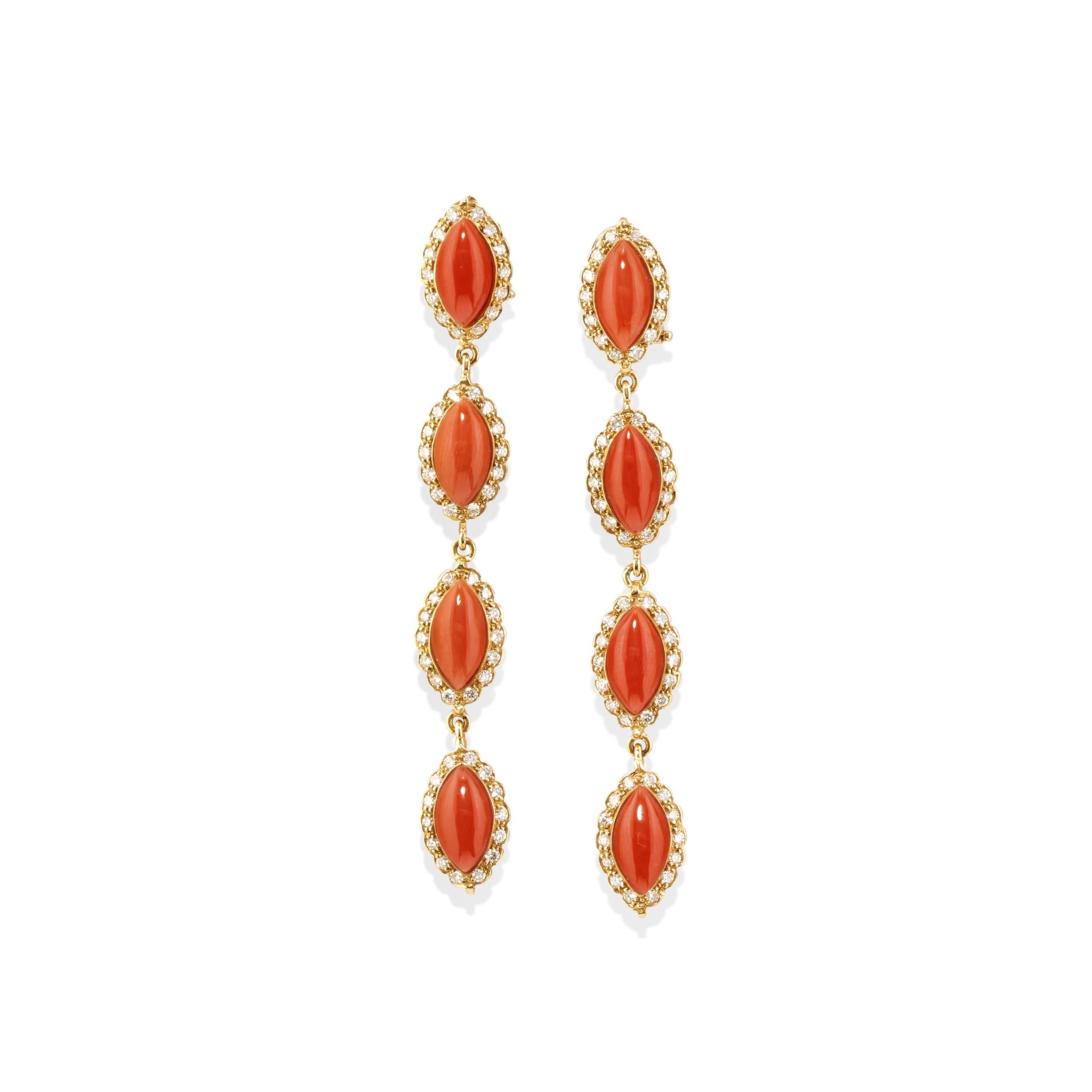 con inserti in corallo taglio marquise cabochon disposti a degradè dall'alto, diamanti taglio brillante per totale ct 2,00, chiusura perno e clip.