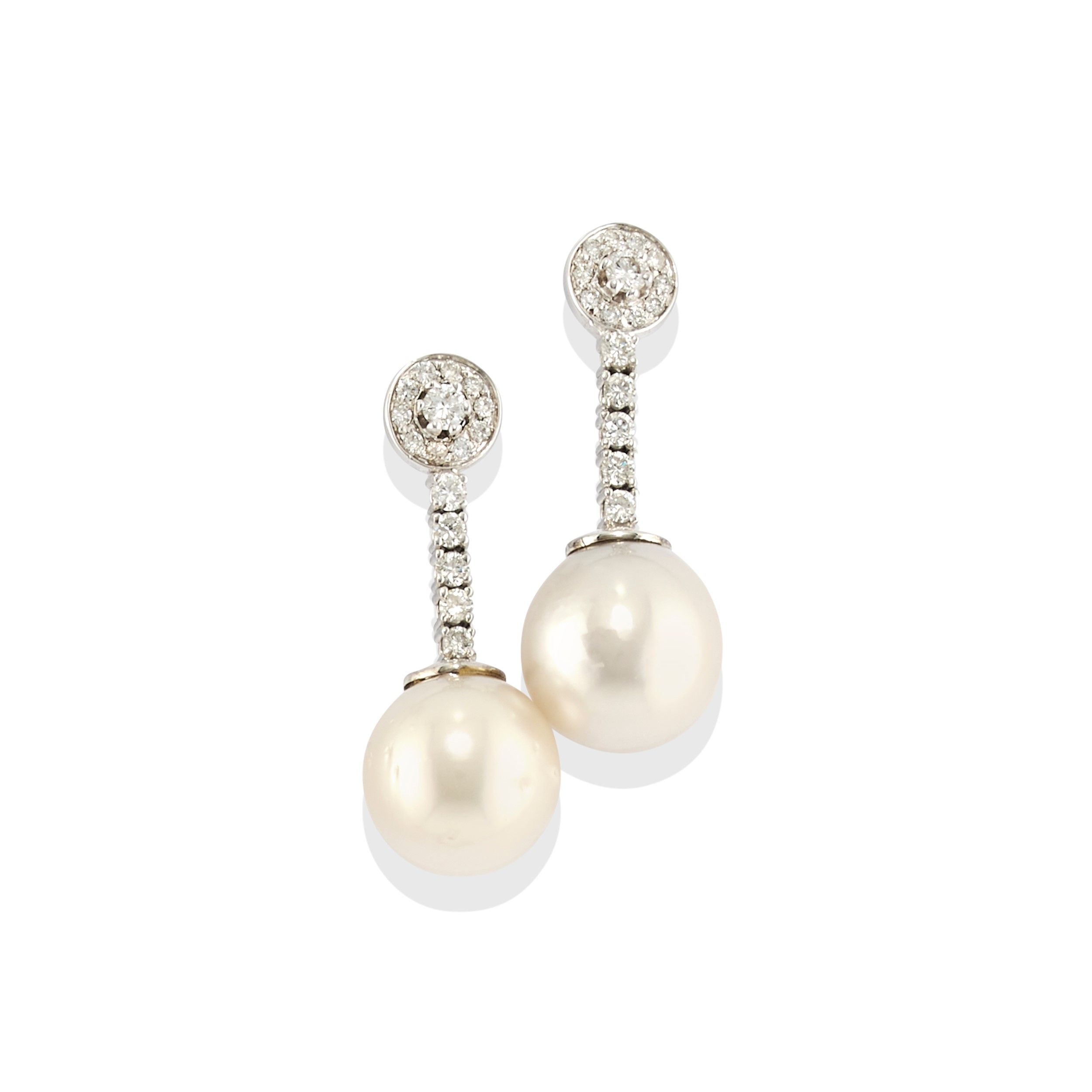 con perle coltivate South Sea di mm 14,00 circa, diamanti taglio brillante per totale ct 1,00 circa, chiusura perno e farfalla.