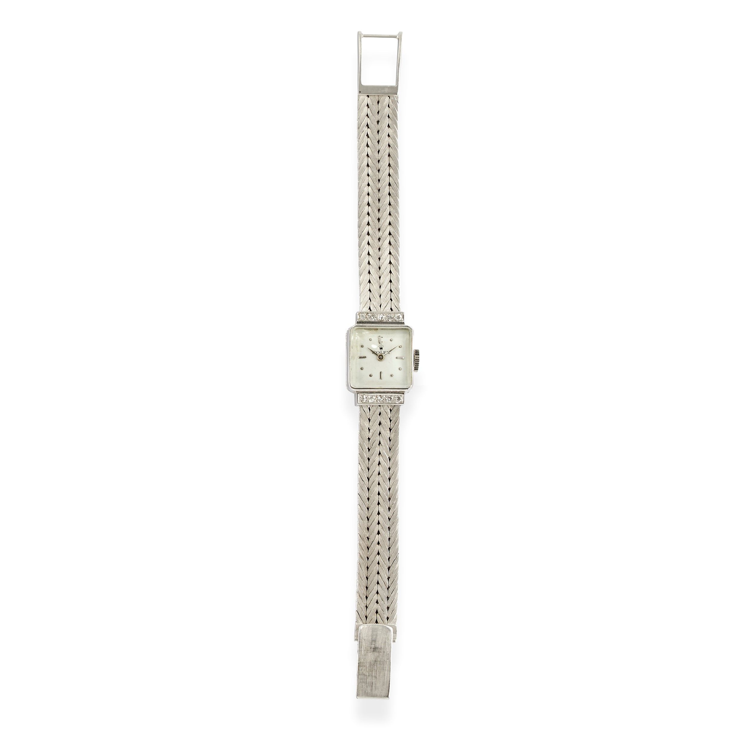 cassa carrè, quadrante bianco con indici applicati, movimento a carica manuale, diamanti taglio huit-huit a decoro, quadrante, cassa e meccanismo firmati, con bracciale incorporato non originale.