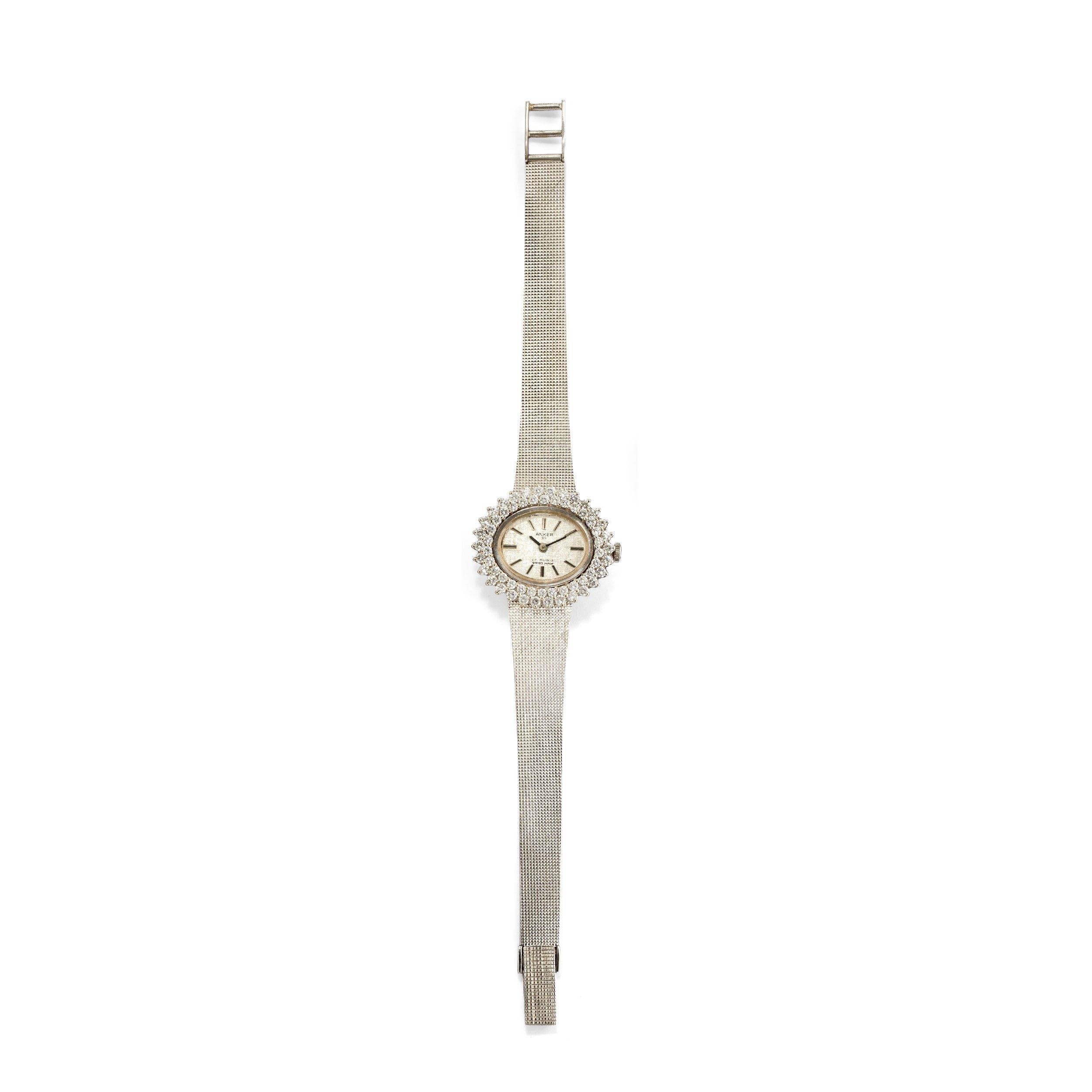 cassa ovale, quadrante chiaro con indici applicati, lunetta in diamanti taglio brillante e movimento a carica manuale.
