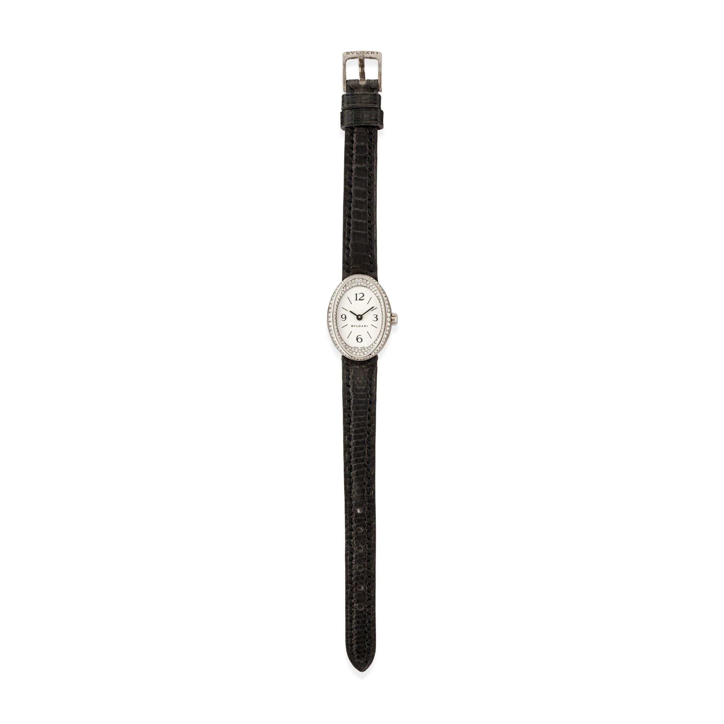 cassa ovale, quadrante bianco con indici e numeri romani in smalto nero, lunetta in diamanti taglio brillante, movimento al quarzo, fibbia originale in oro bianco 18k, con scatola.