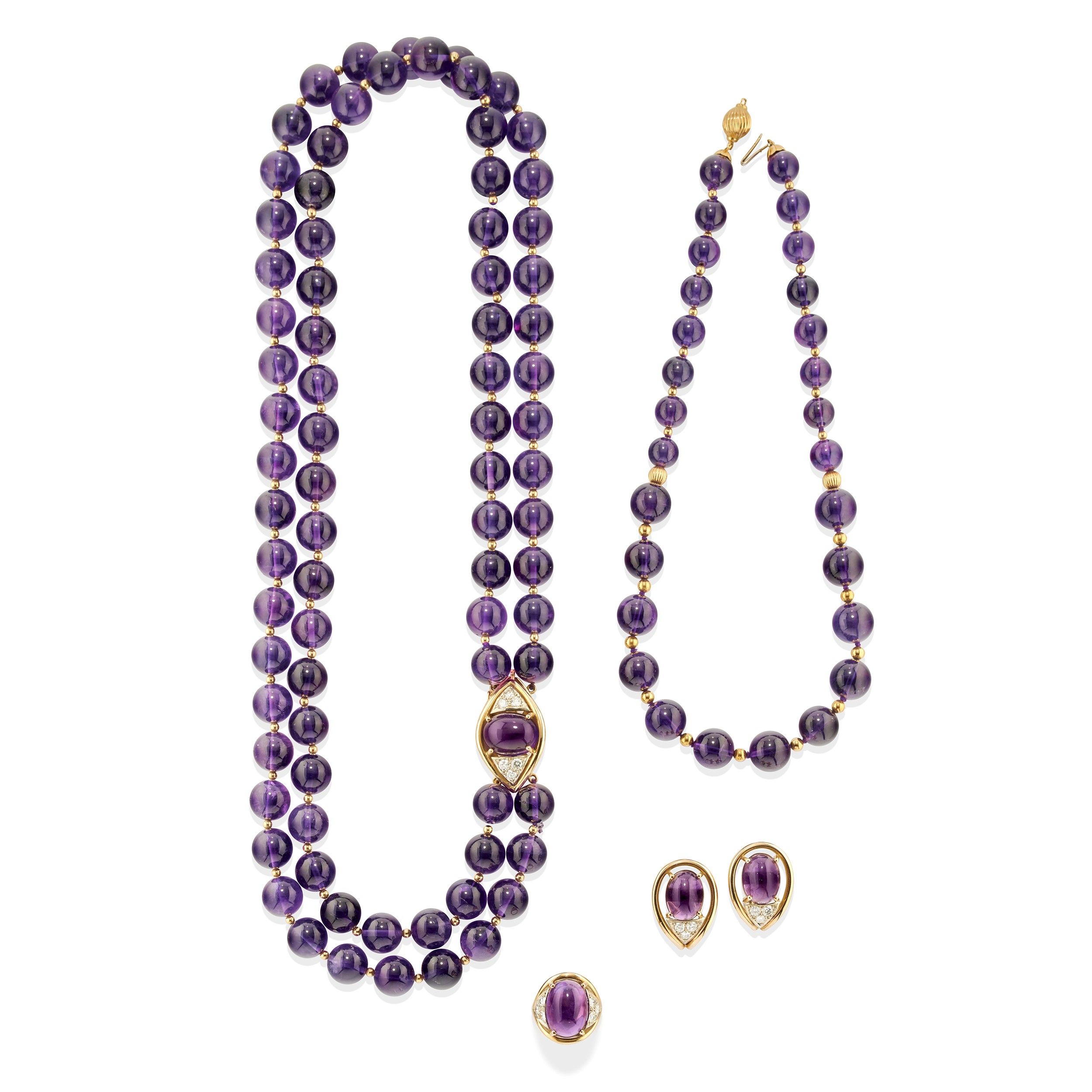 composta da una collana a due fili di boules di mm 13,00 circa, una collana con boules a degradé dal centro di mm 13,00/10,00 circa, un anello e una coppia di orecchini con chiusura perno e clip, diamanti taglio brillante per totale ct 2,50 circa.
