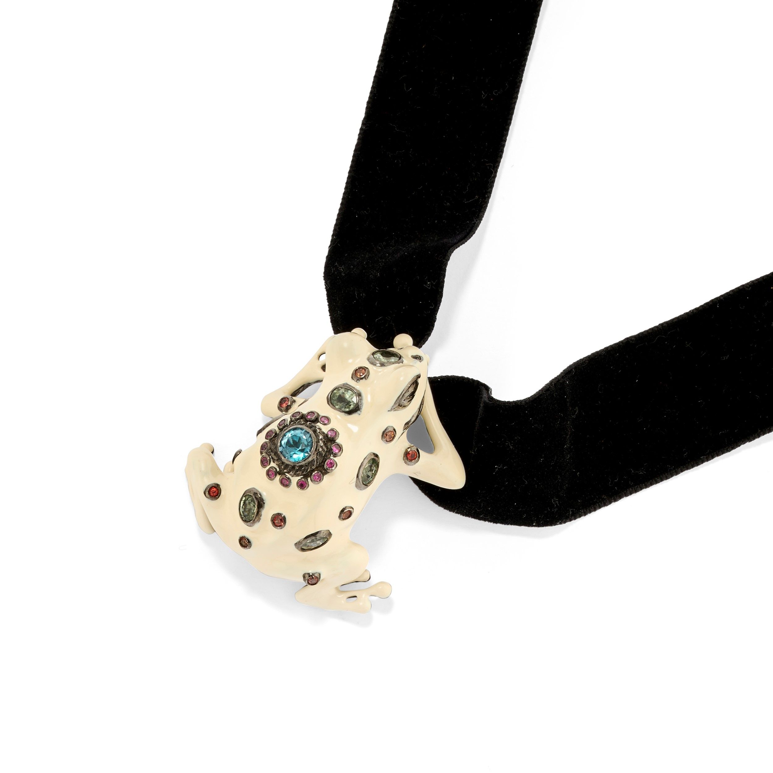 in smalto bianco con pietre colorate taglio ovale e rotondo, trattenuto da nastro nero in velluto.