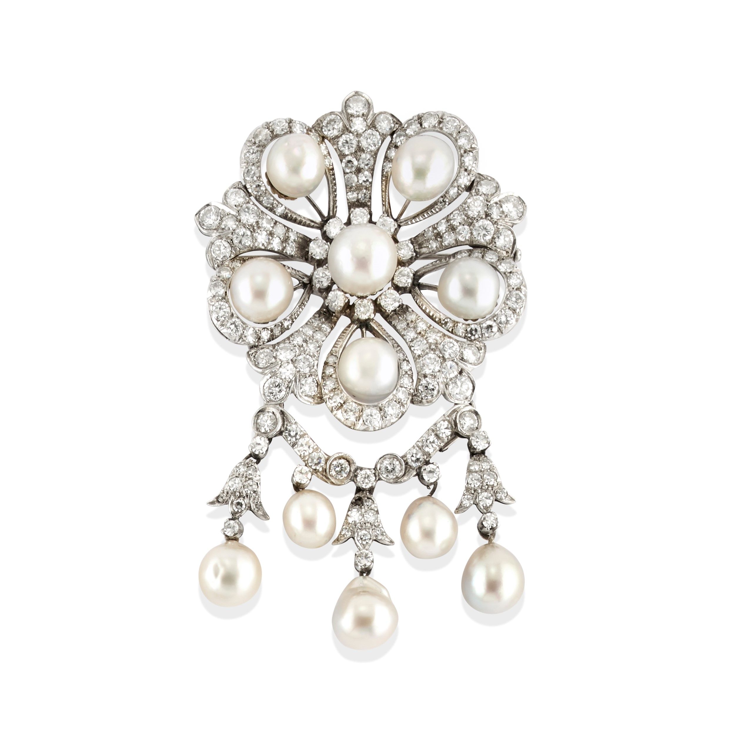 scomponibile in due spille, parte superiore a fiore con sei perle coltivate di mm 8,50/9,50 circa, indossabile anche come pendente, parte inferiore con cinque perle coltivate di mm 9,00 circa, interamente impreziosita da diamanti taglio brillante e huit-huit per totale ct 6,00 circa.
