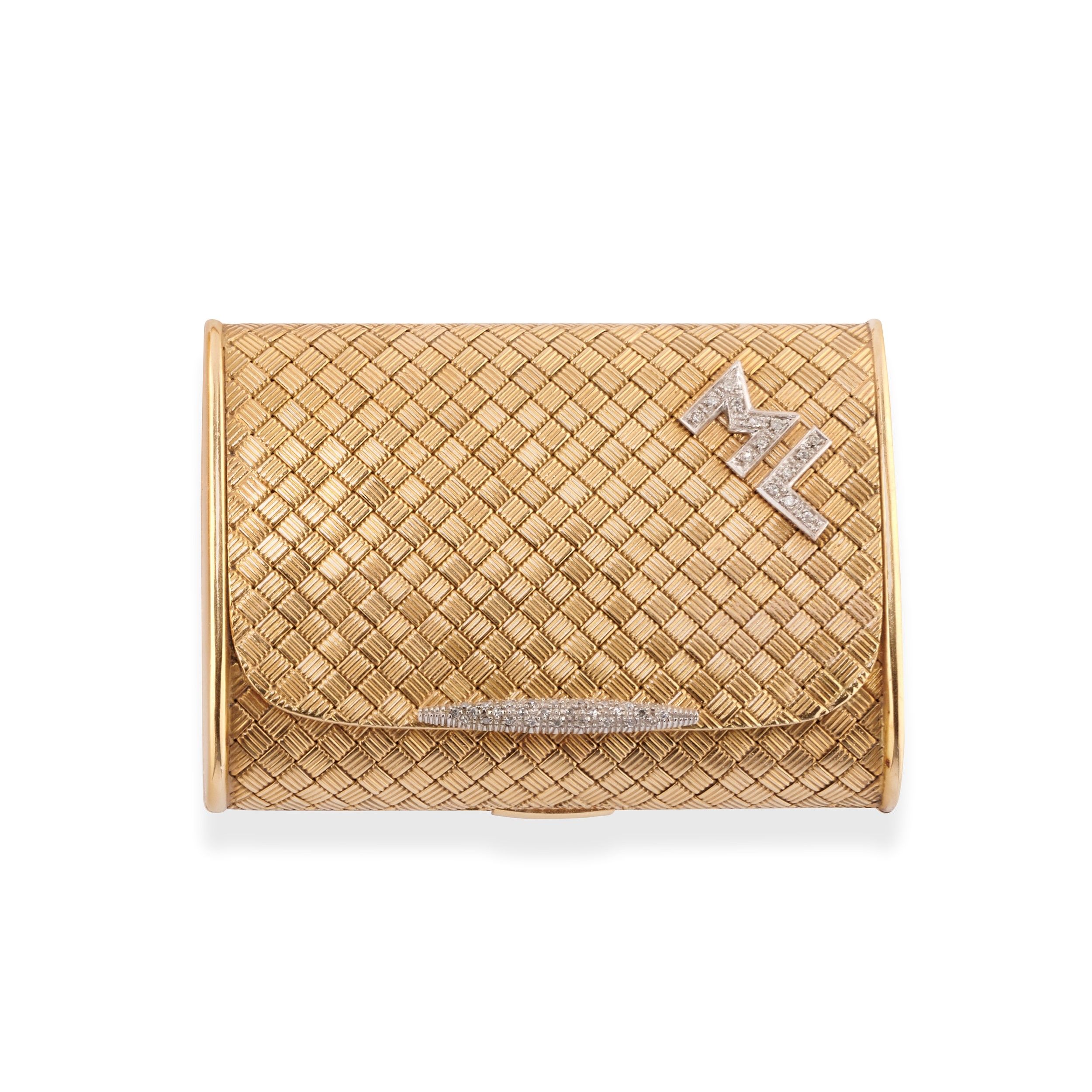 realizzata con decoro a tessuto, all'interno specchio retina e piumino, diamanti taglio huit-huit, con iniziali.