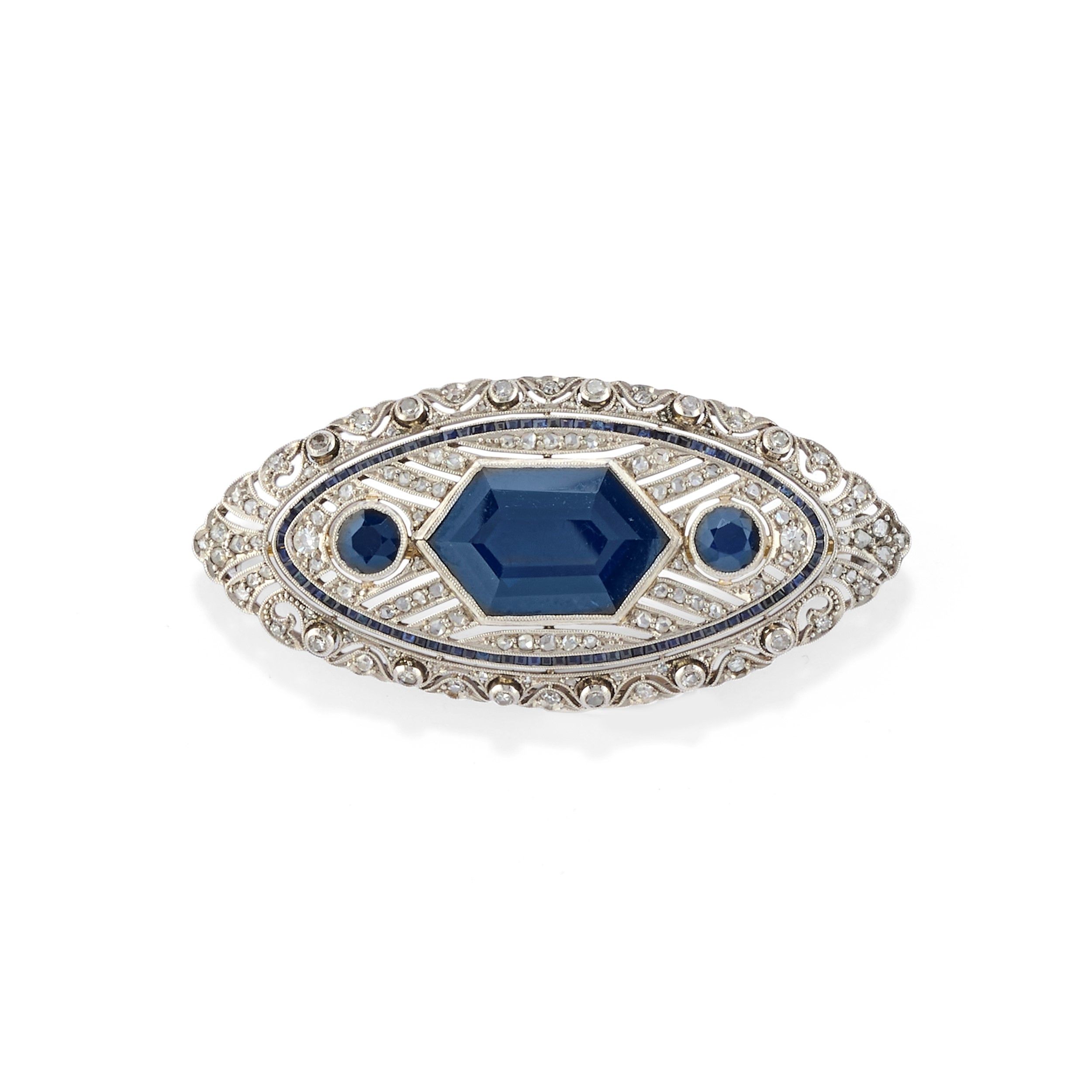 1920 circa a saponetta traforata, con zaffiro taglio esagonale, diamanti taglio rosa e huit-huit e zaffiri taglio rotondo e carrè.