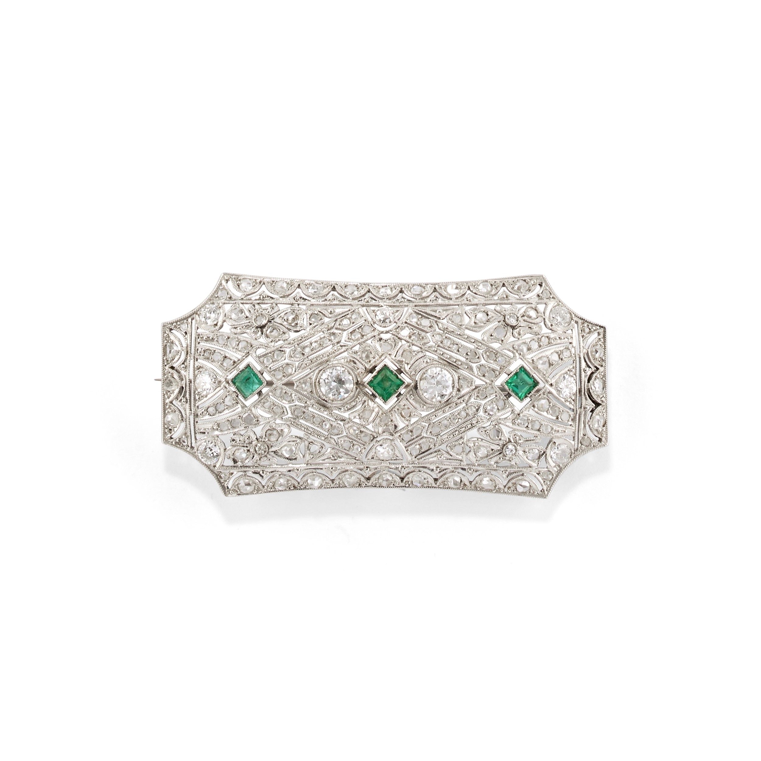interamente traforata, diamanti taglio vecchio e rosa, smeraldi taglio carrè e decoro a milligrano.