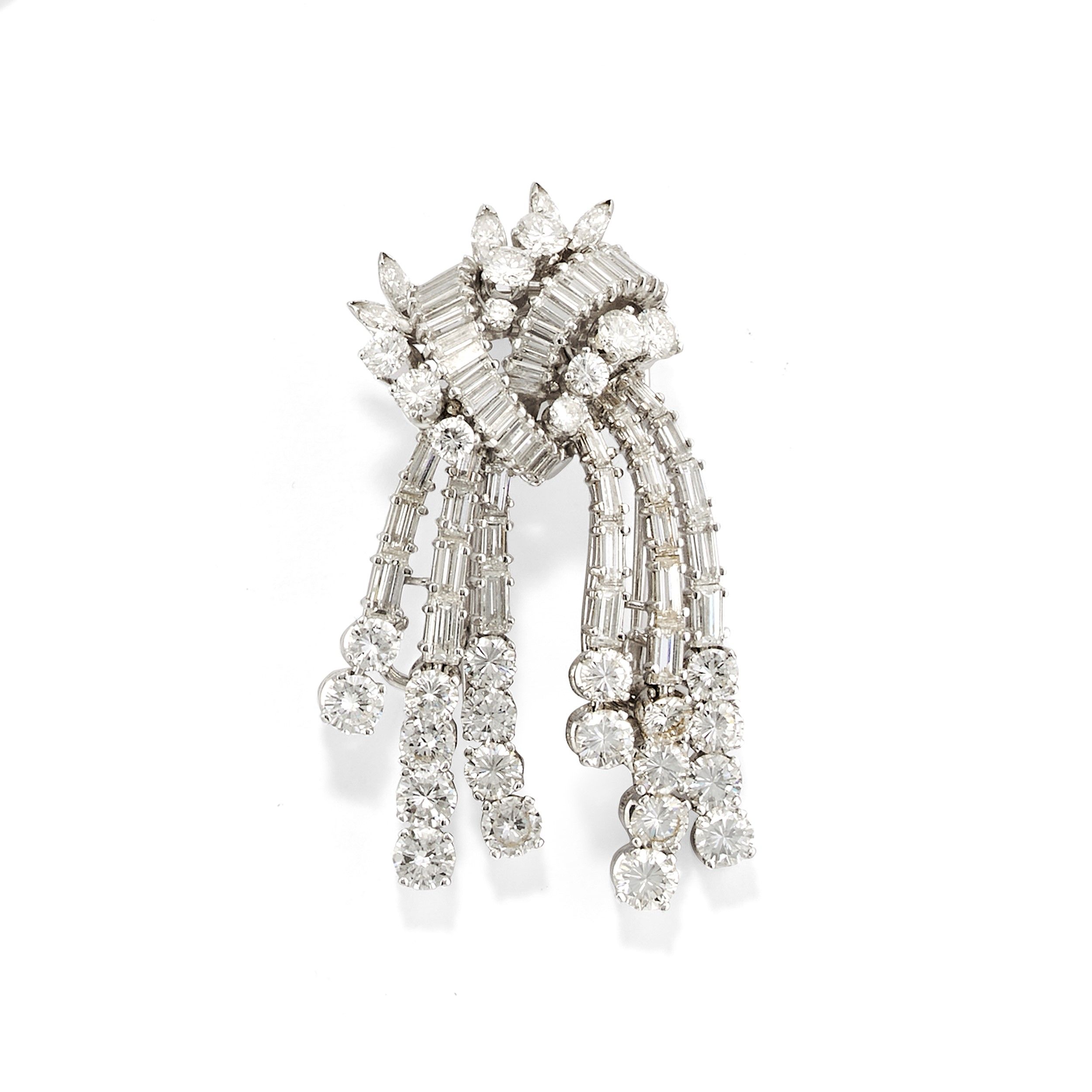 a fiocco nastrato decorata da diamanti taglio brillante, baguette e navette per totale ct 8,00 circa.