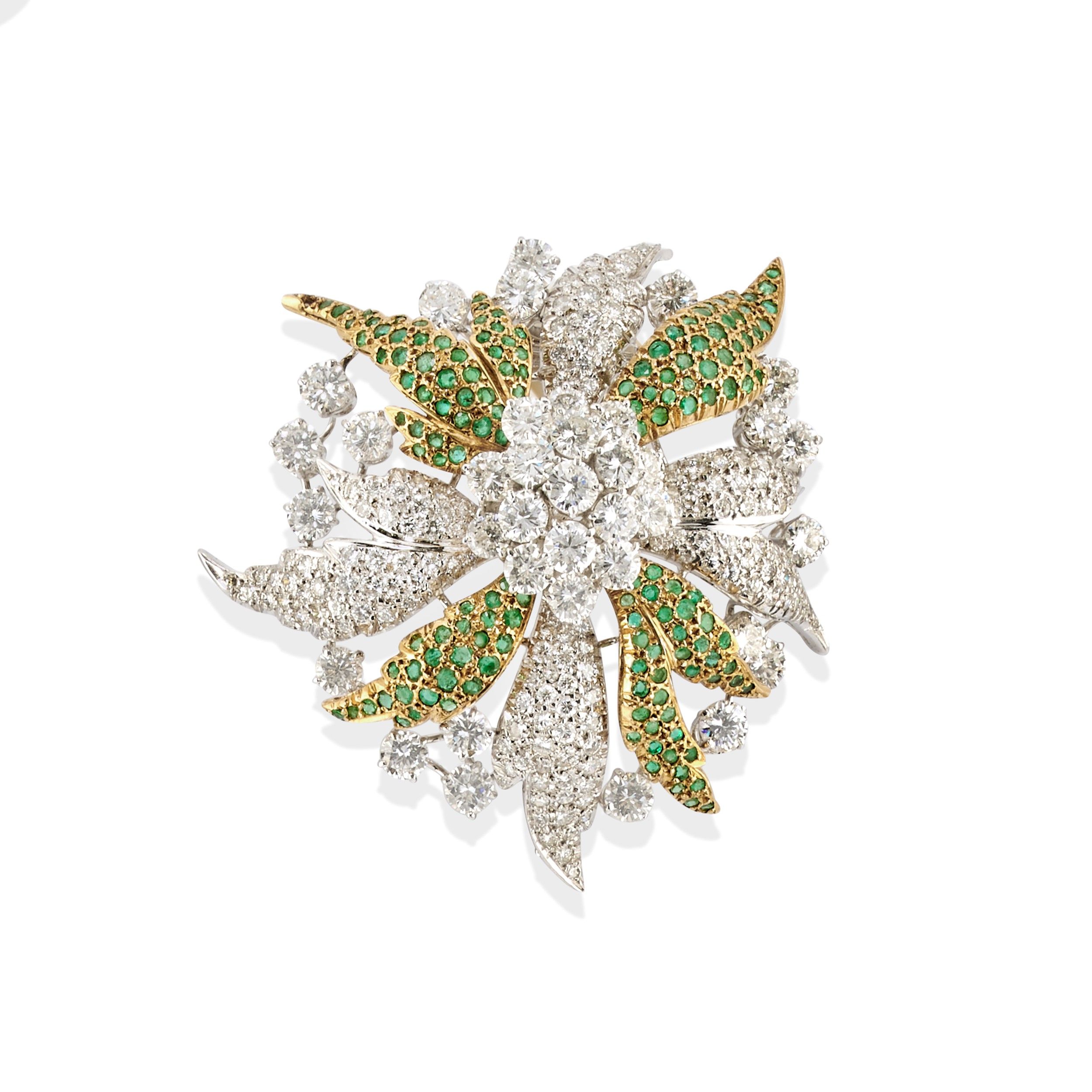 interamente percorsa da diamanti taglio brillante per totale ct 10,00 circa, prob. colore G/H, purezza VVS/VS e smeraldi taglio rotondo.