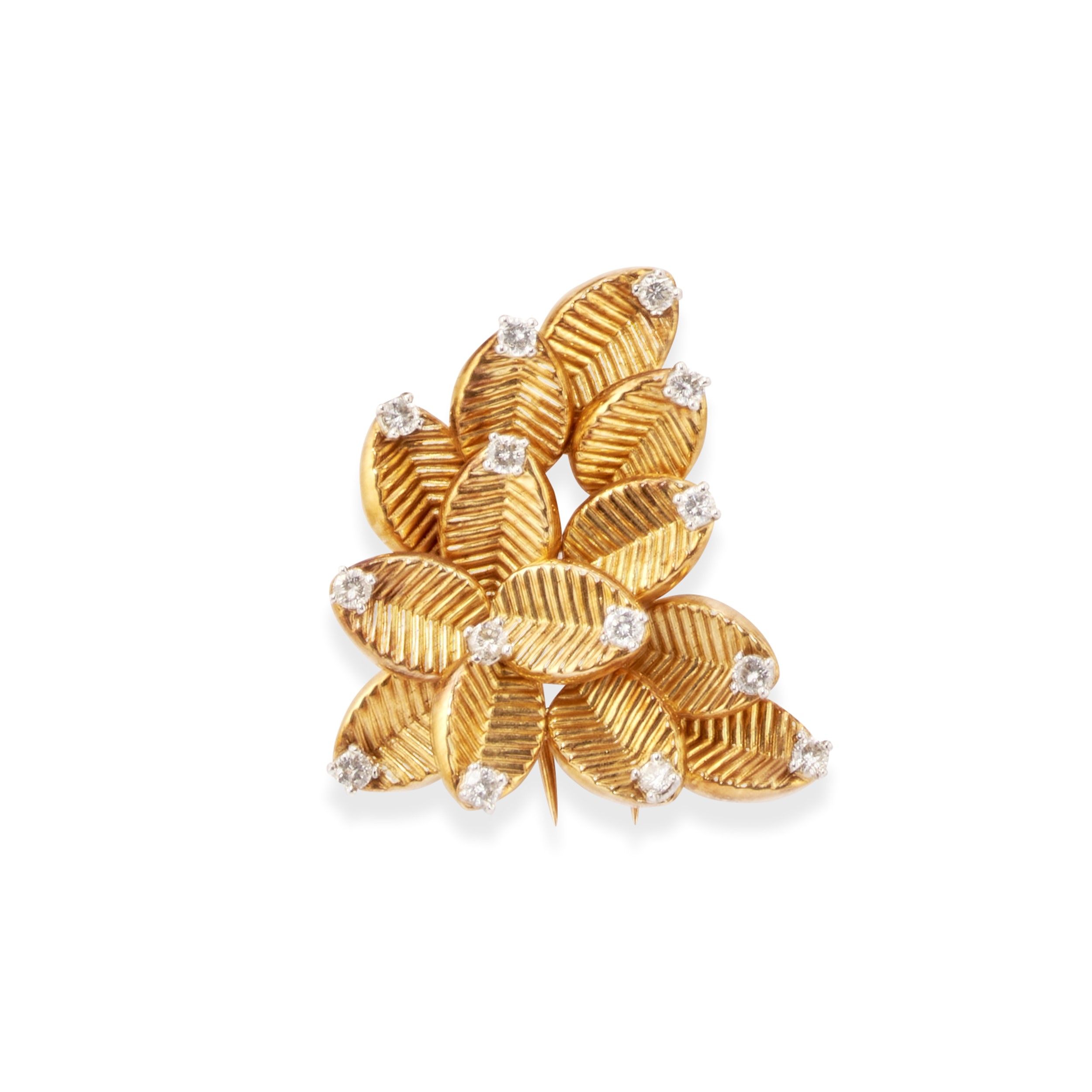 a foglie incise, diamanti taglio brillante per totale ct 1,00 circa, con astuccio.