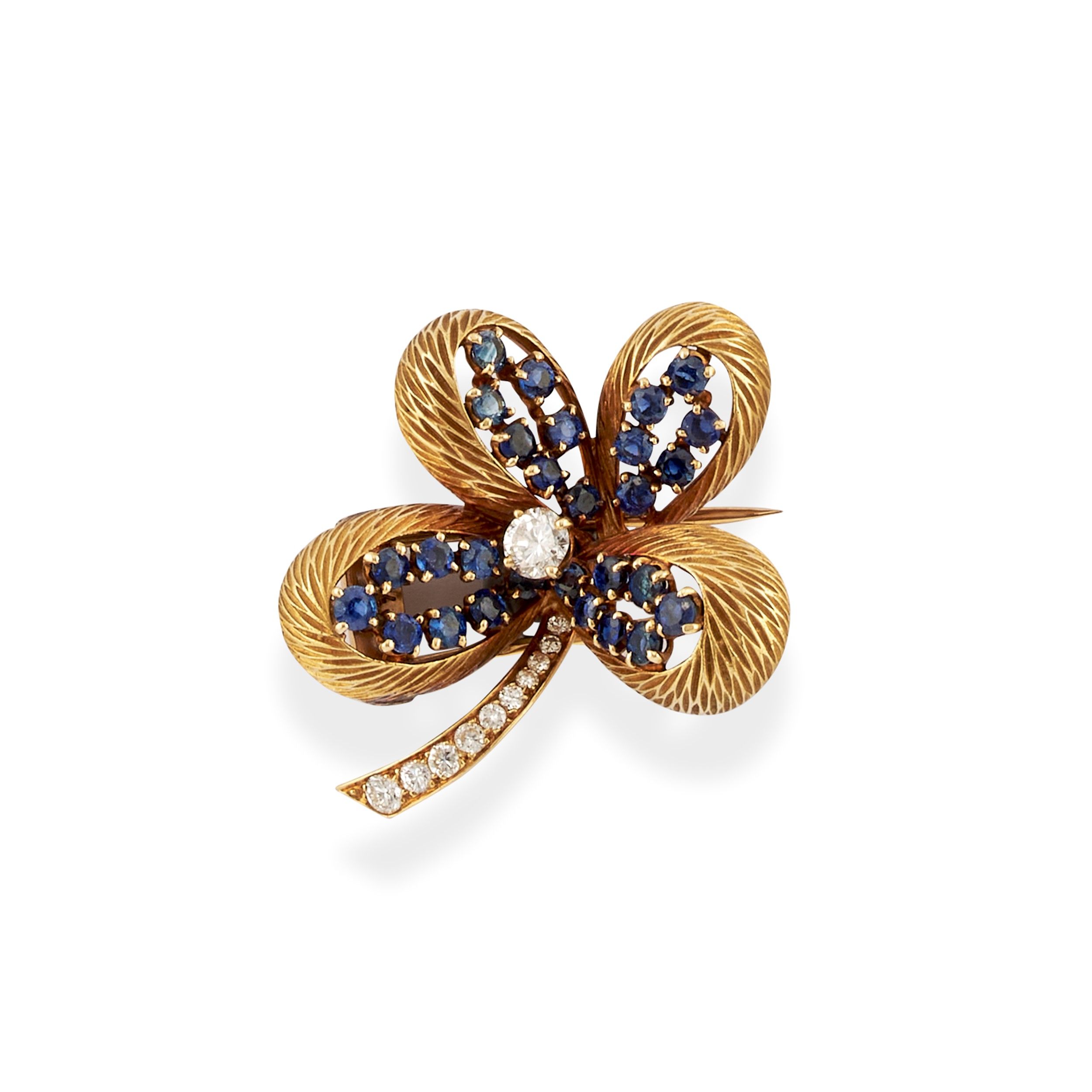 petali incisi, al centro diamante taglio brillante di totale ct 0,30 circa, zaffiri taglio rotondo e piccoli diamanti taglio brillante sul gambo.