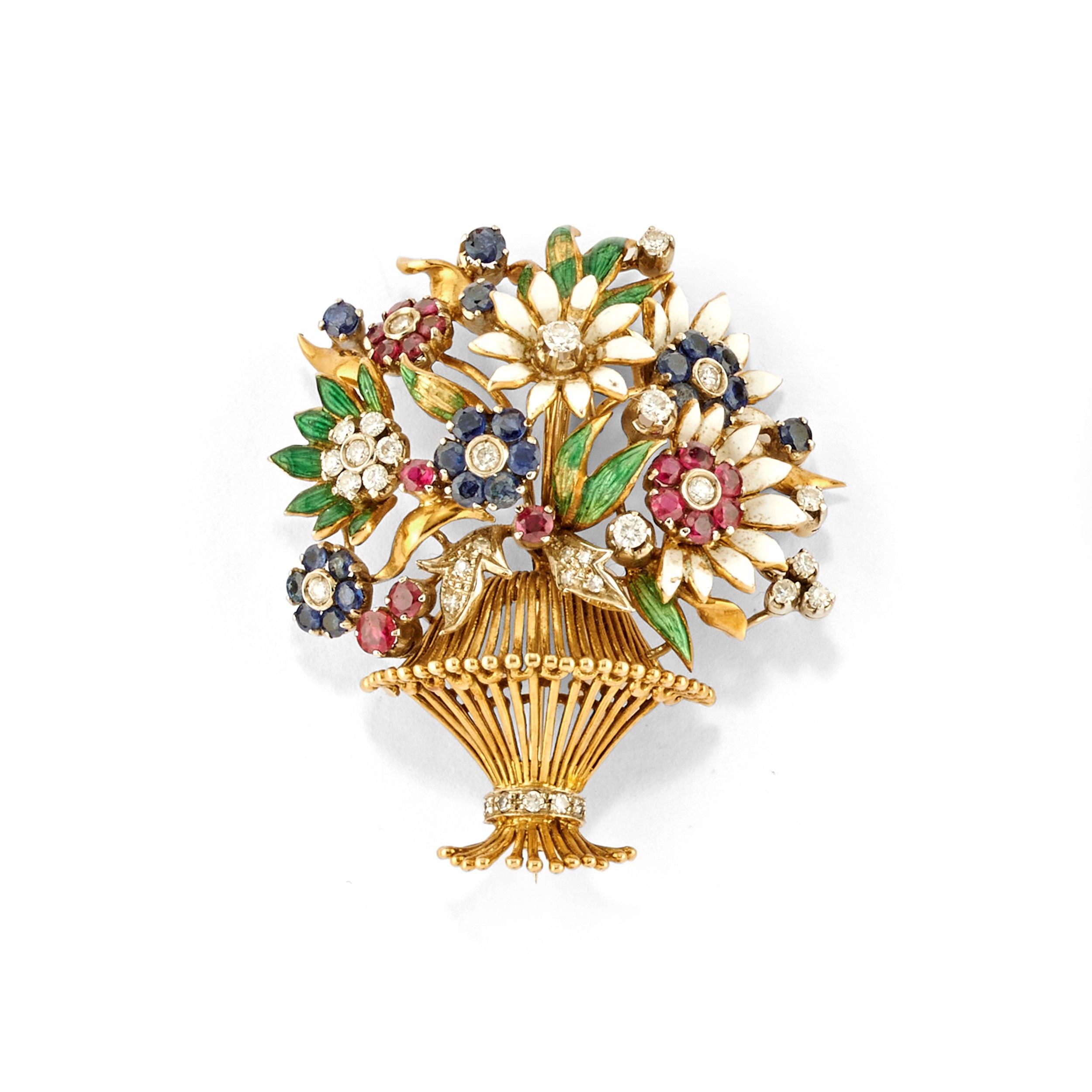 con rubini, zaffiri e diamanti taglio rotondo, smalto policromo, difetti (piccole mancanze di smalto).