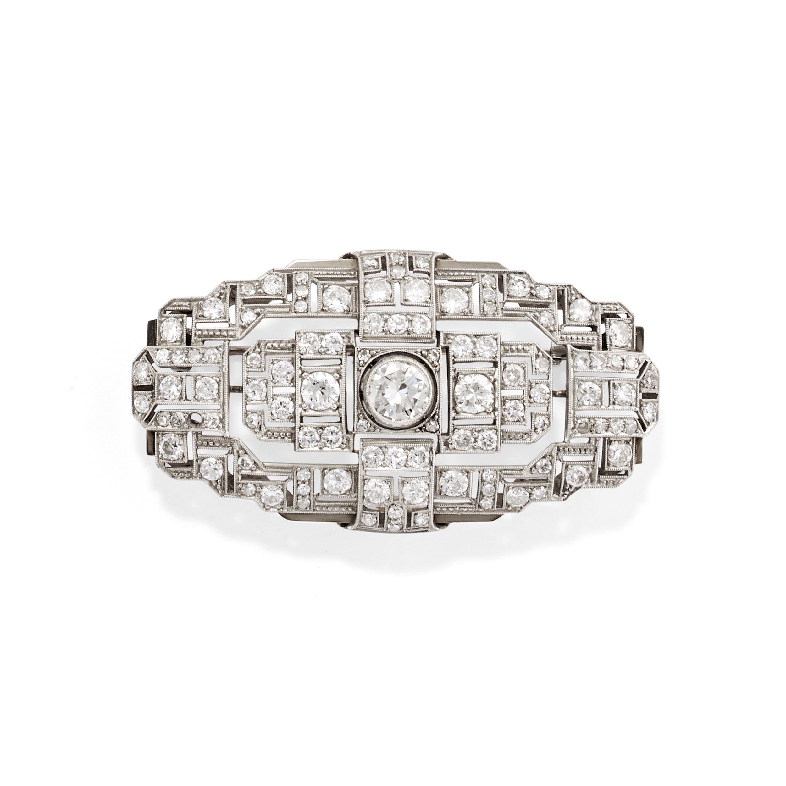 1930 circa a saponetta con al centro diamante taglio vecchio di ct 1,00 circa, contorno in diamanti taglio vecchio, brillante e huit-huit per totale ct 2,50 circa, decoro a milligrano, difetti (un diamante mancante).