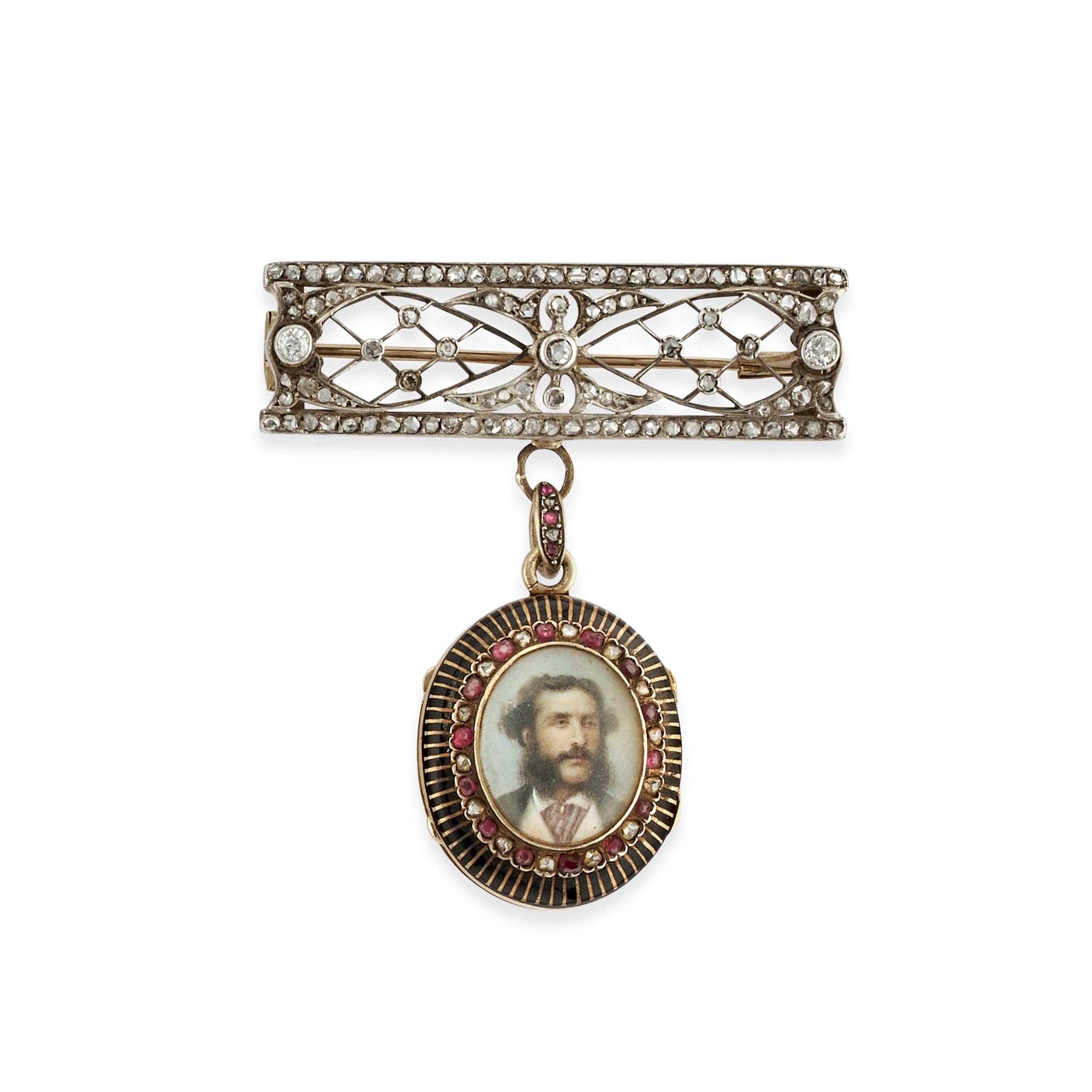 in argento, oro giallo 18k e bassa caratura, Peso g 18,70 cm 4,90x5,30 parte superiore a barretta con diamanti taglio vecchio e rosa, parte inferiore di forma ovale con figura maschile dipinta entro cornice in piccoli rubini, diamanti e smalto, all'interno porta foto.