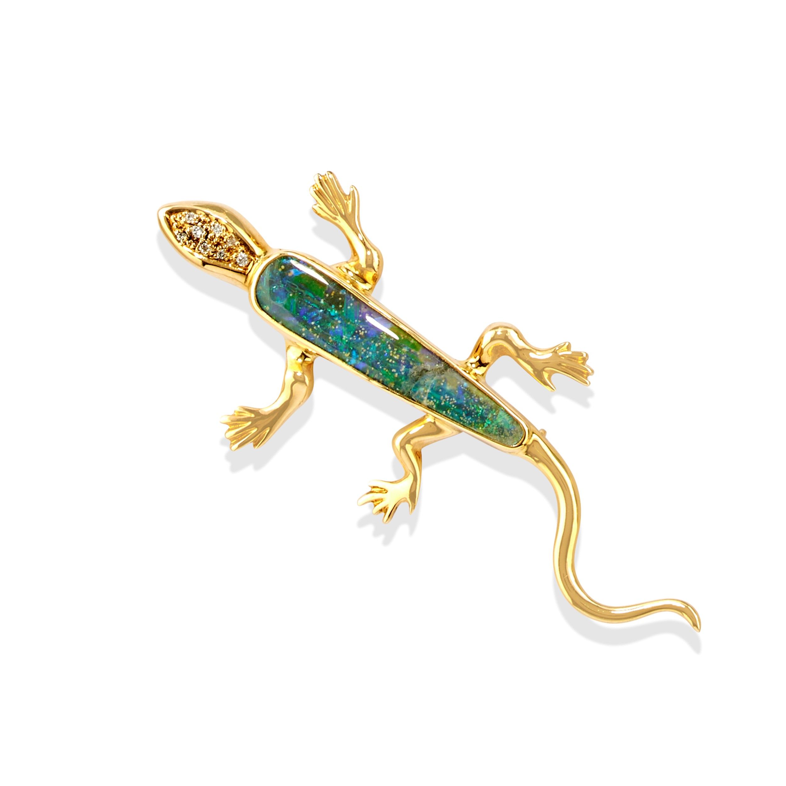 a forma di lucertola con opale e piccoli diamanti taglio brillante, difetti (opale rotto).