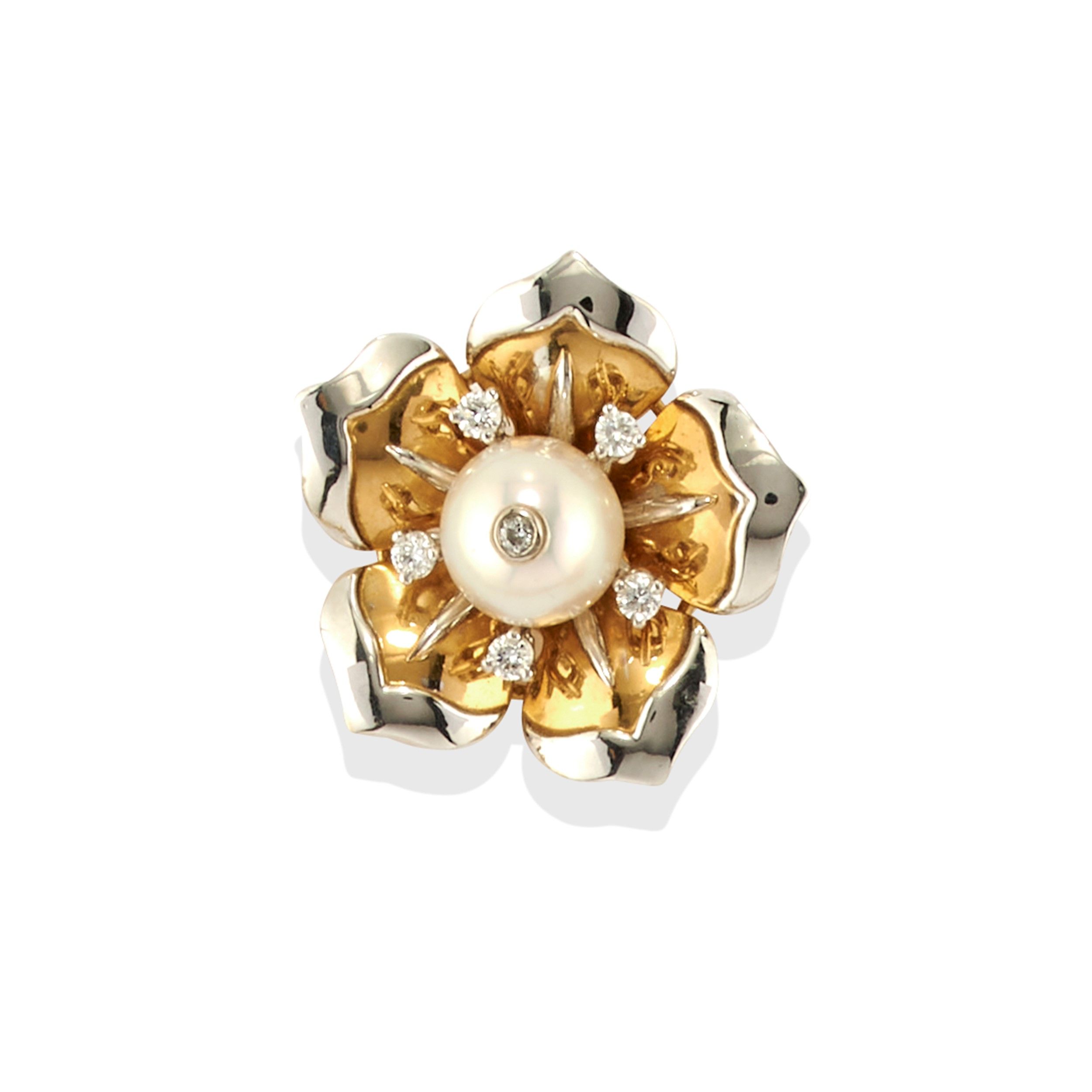 a fiore, al centro perla coltivata di mm 8,00 circa, diamanti taglio brillante per totale ct 0,15 circa.