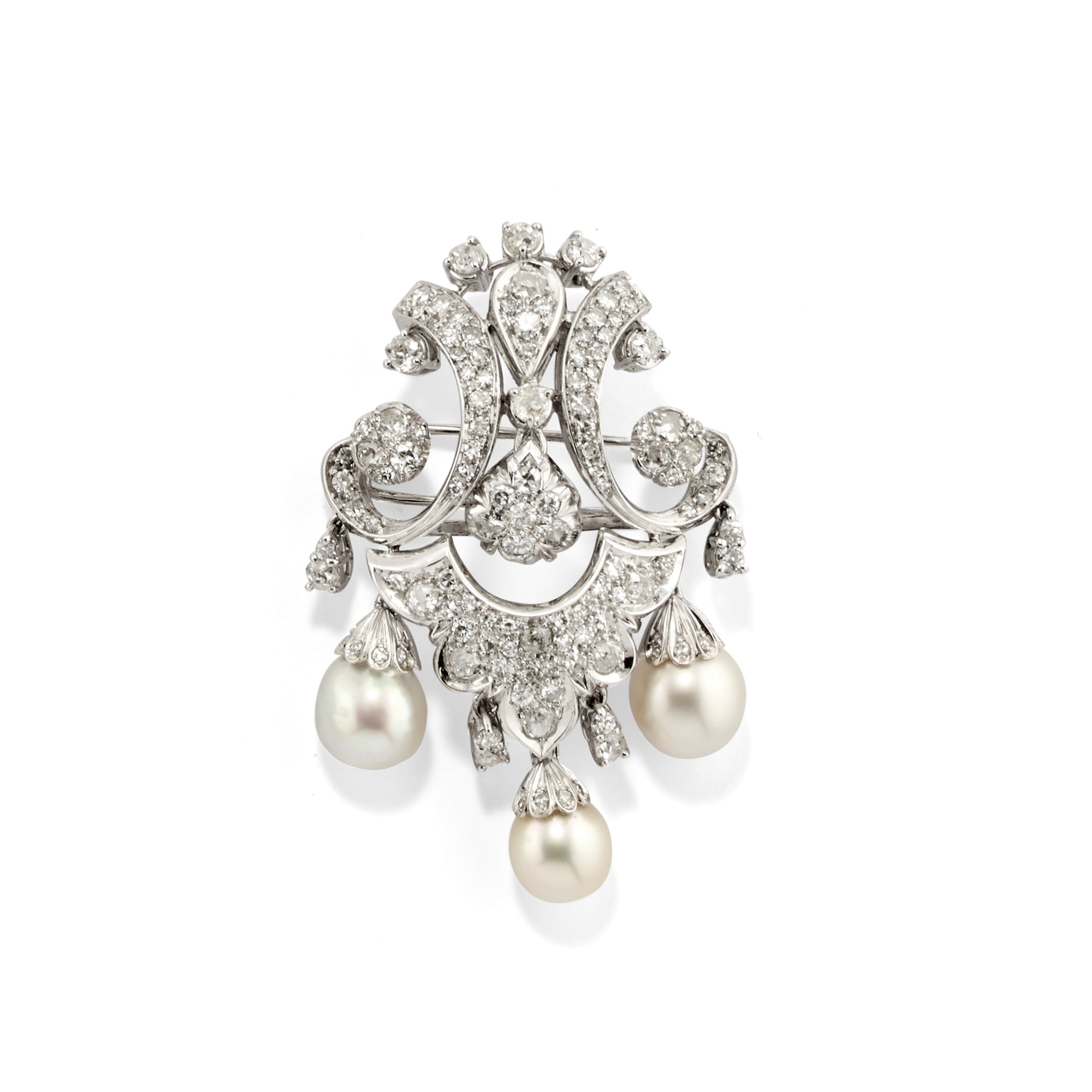 realizzata a scudo con diamanti taglio vecchio e huit-huit per totale ct 3,00 circa e perle coltivate.