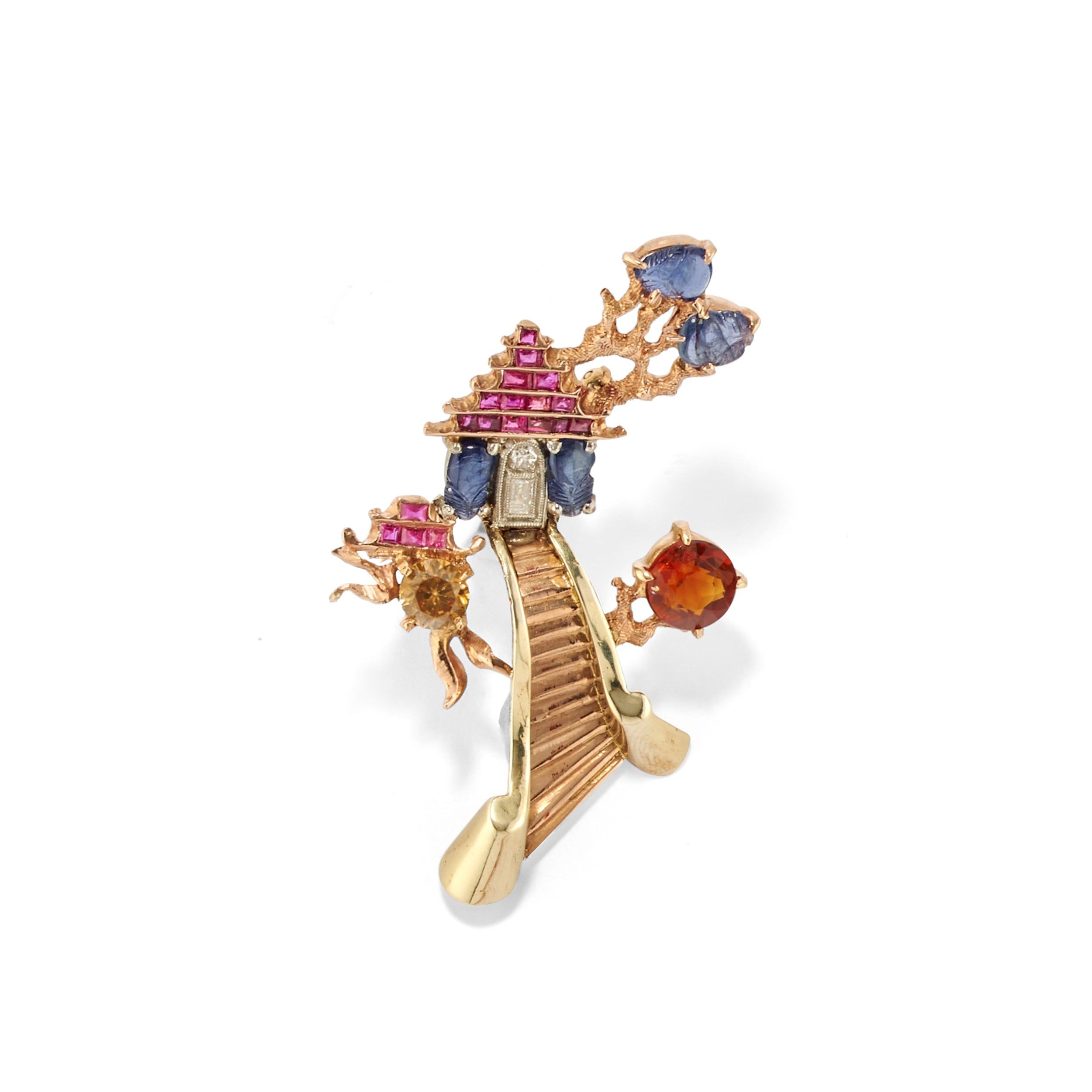 con rubini taglio carrè, zaffiri incisi a foglia, diamanti taglio vecchio e rettangolare e pietre di colore.