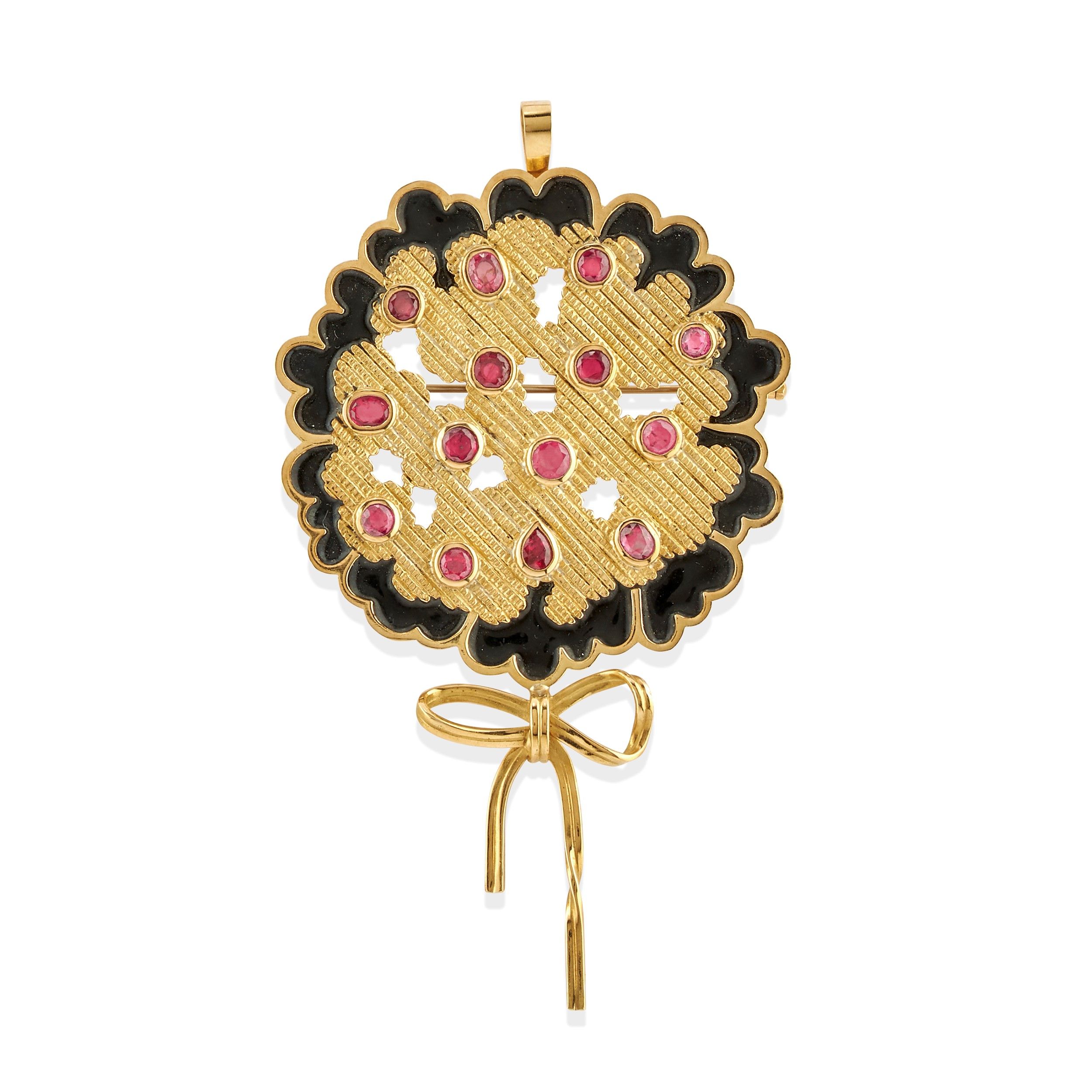 smalto nero e rubini taglio rotondo, ovale e goccia.