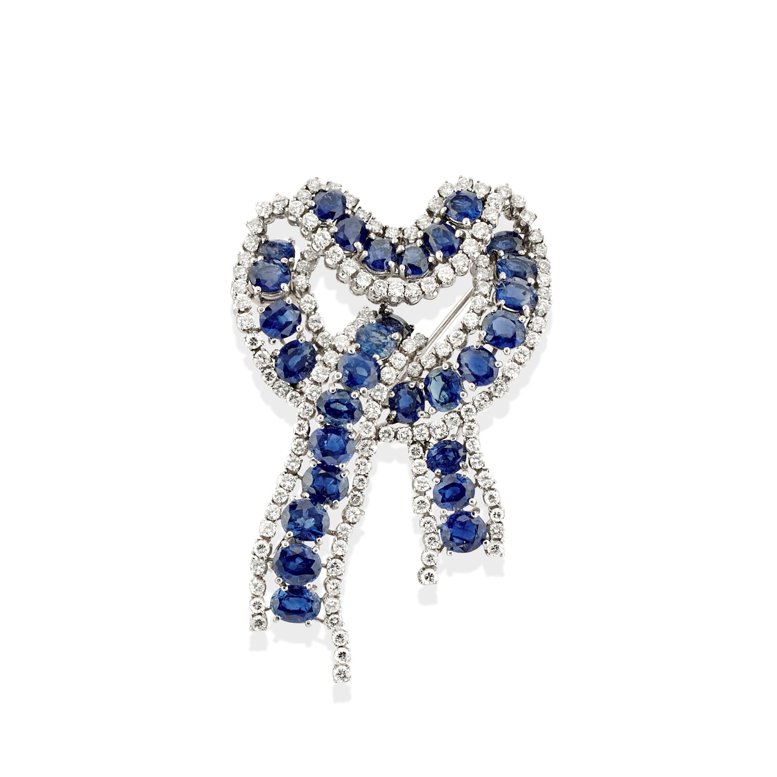 a fiocco, percorso da zaffiri taglio ovale per totale ct 12,00 circa con profilo in diamanti taglio brillante per totale ct 4,00 circa.