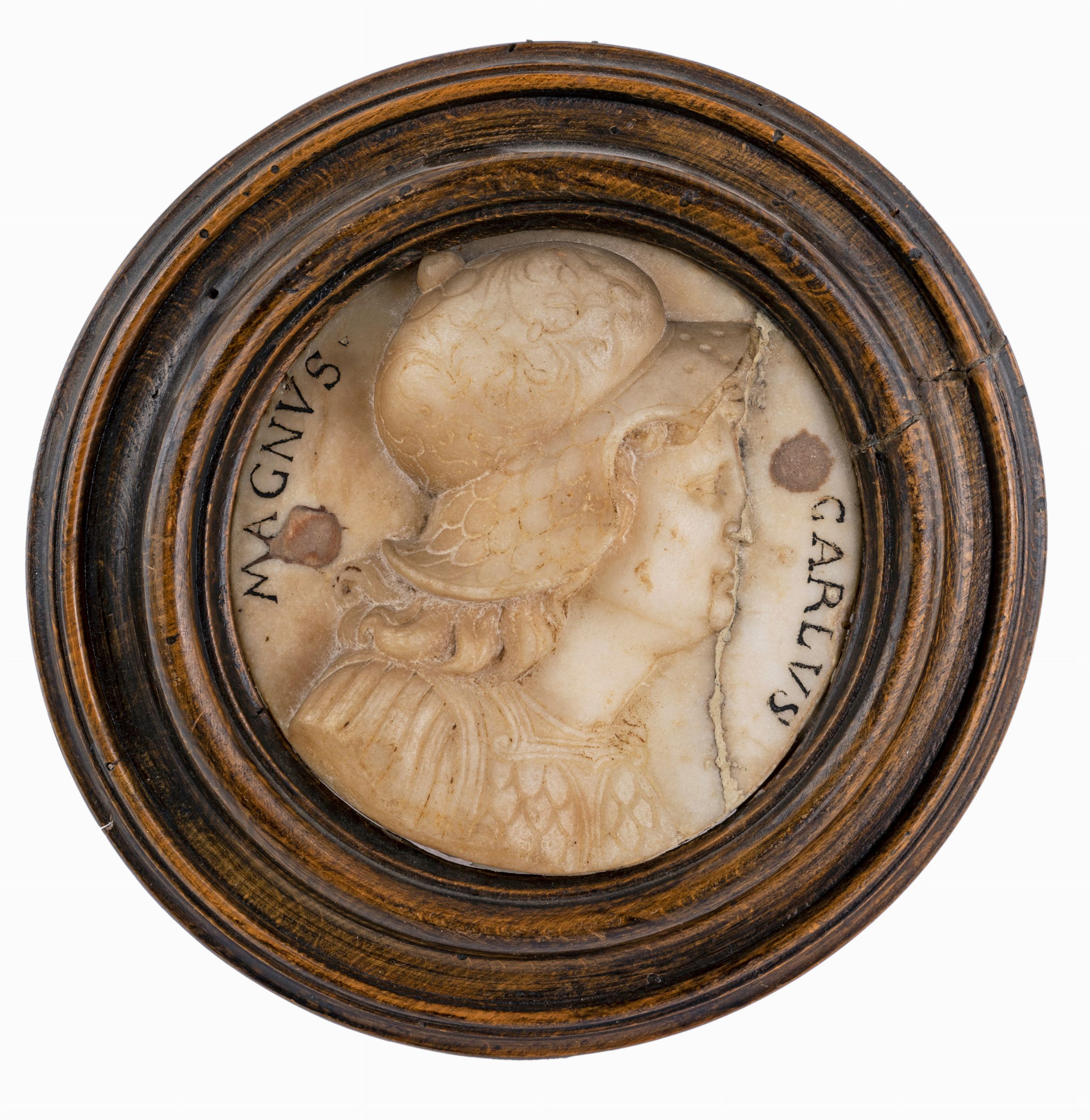 XVI-XVII secolo D/ MAGNUS CARLUS Profilo dell'Imperatore Carlo Magno. Frattura restaurata con ricostruzione di parte del naso. Entro cornice in legno.