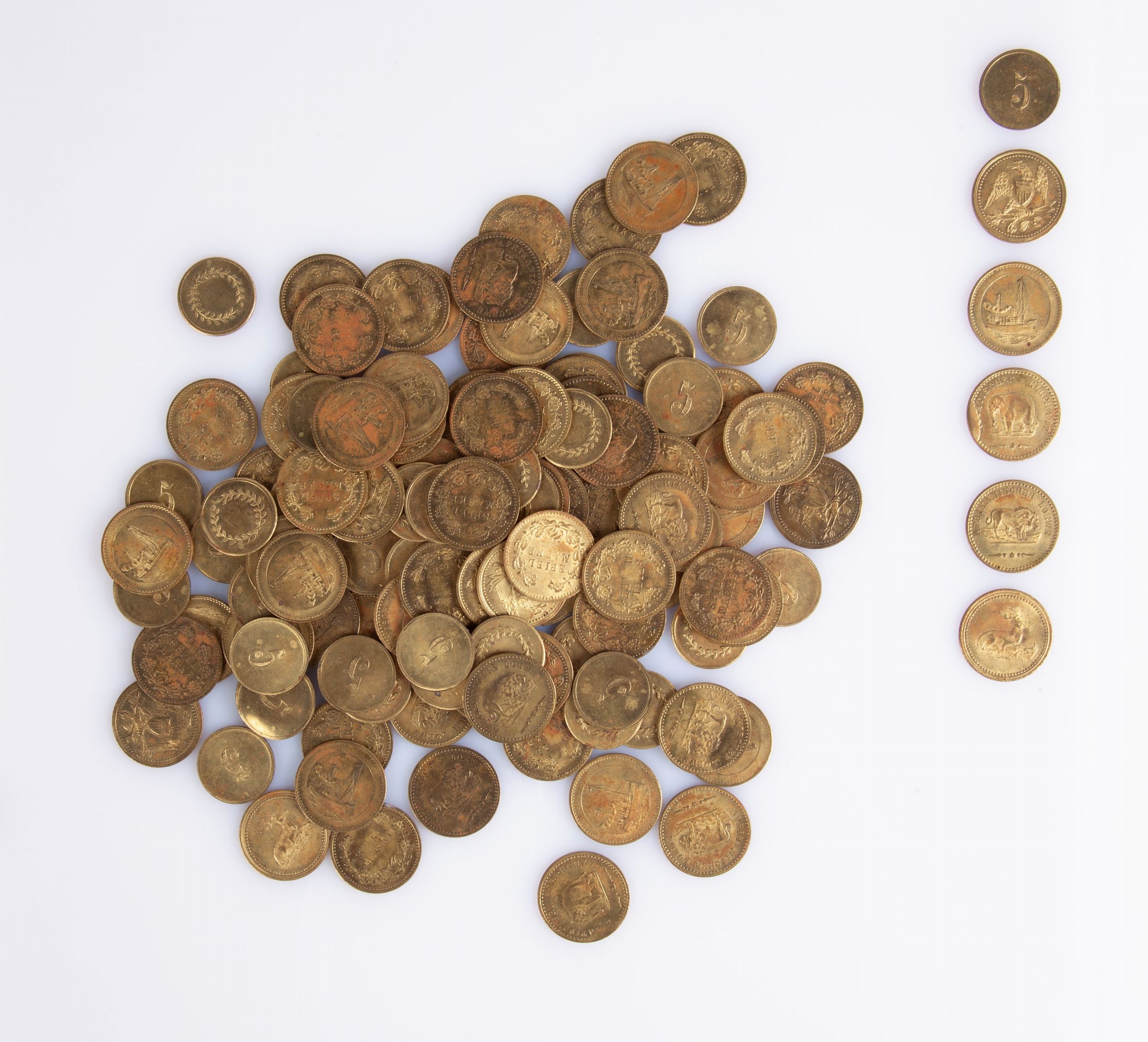 Lotto di 129 Spiele Munzen (Monete da gioco) in ottone e 2 Gettoni in metallo