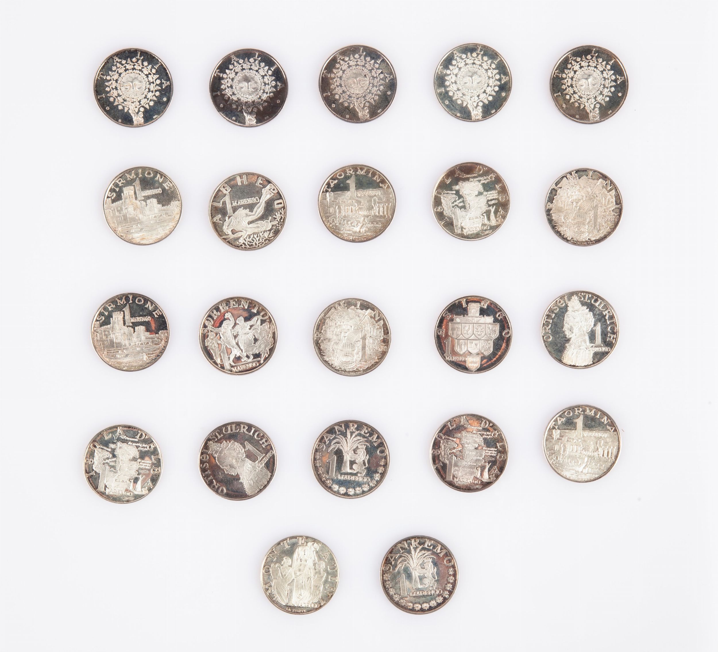 Lotto di 22 medaglie marenghi del sole in argento 925/000
