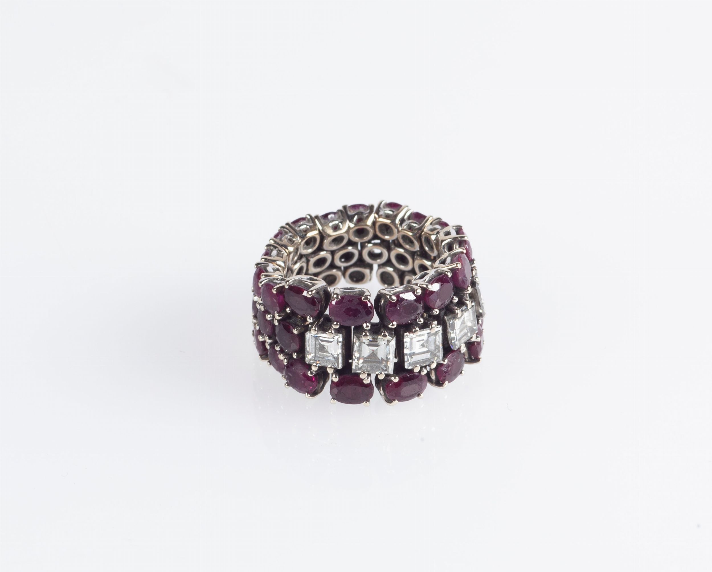 Oro bianco 750/000. Diamanti in taglio carré FG VVS VS ct. 2,20 ca. Rubini ct. 3 ca. Peso complessivo gr. 12,50