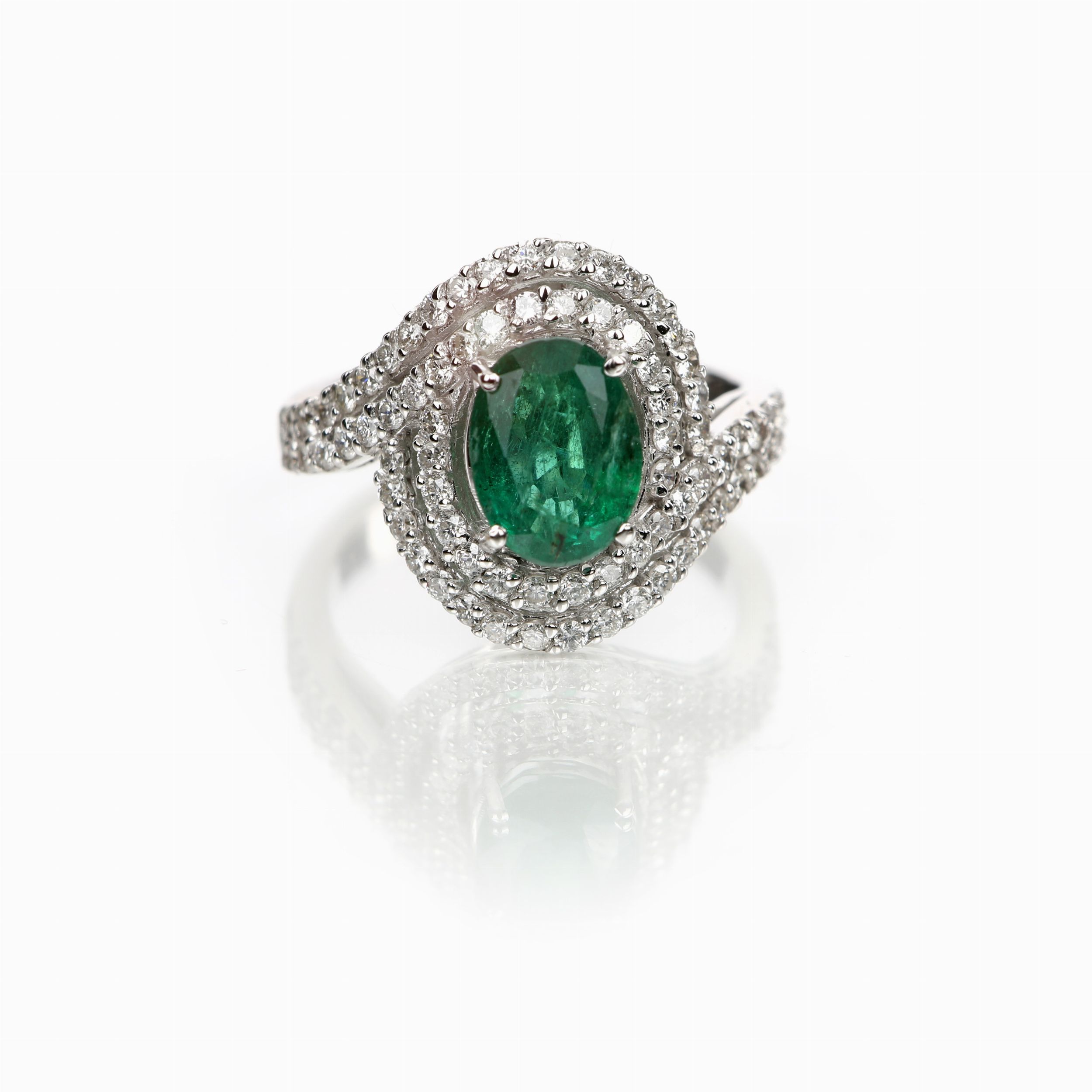 Oro bianco 750/000, diamanti in taglio rotondo brillante ct 1,10 ca. G VS, smeraldo ct. 2,05. Peso complessivo gr. 6,80. Corredato di certificazione gemmologica.