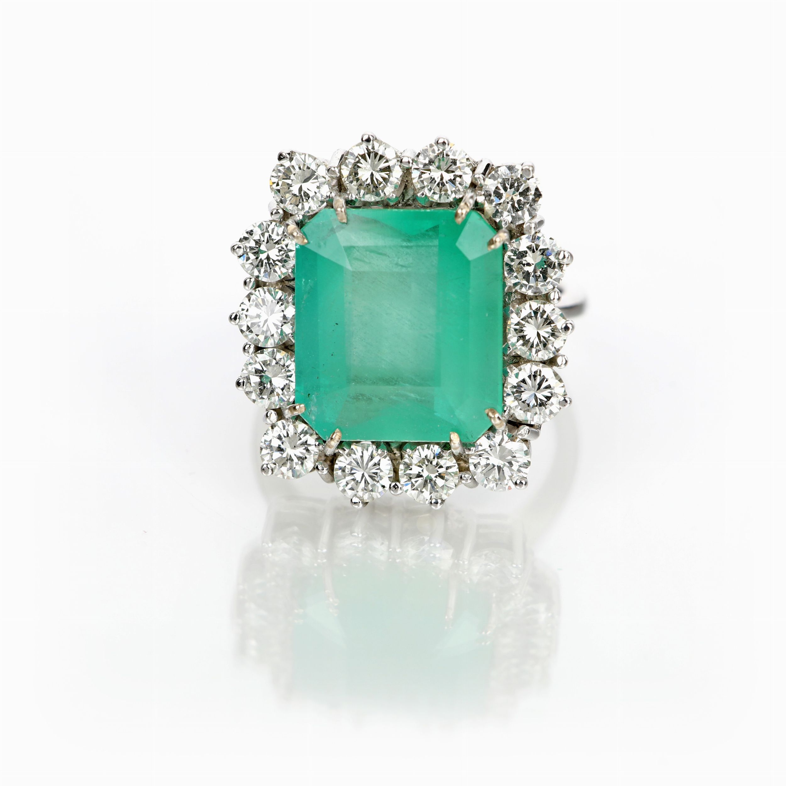 Oro bianco 750/000, diamanti in taglio rotondo brillante ct. 2,40 G-J VS1, smeraldo in taglio smeraldo ct. 9,50. Peso complessivo gr. 9,60. Corredato di certificazione gemmologica.
